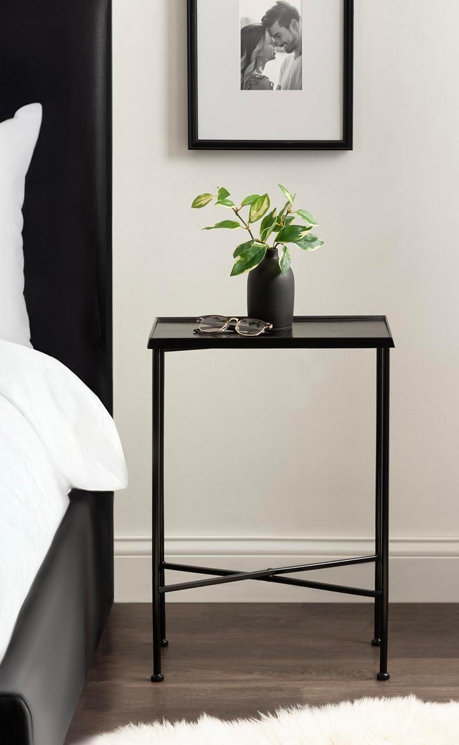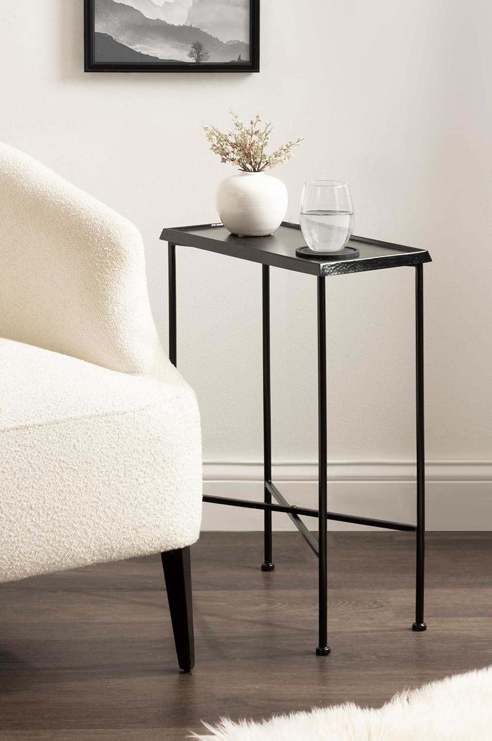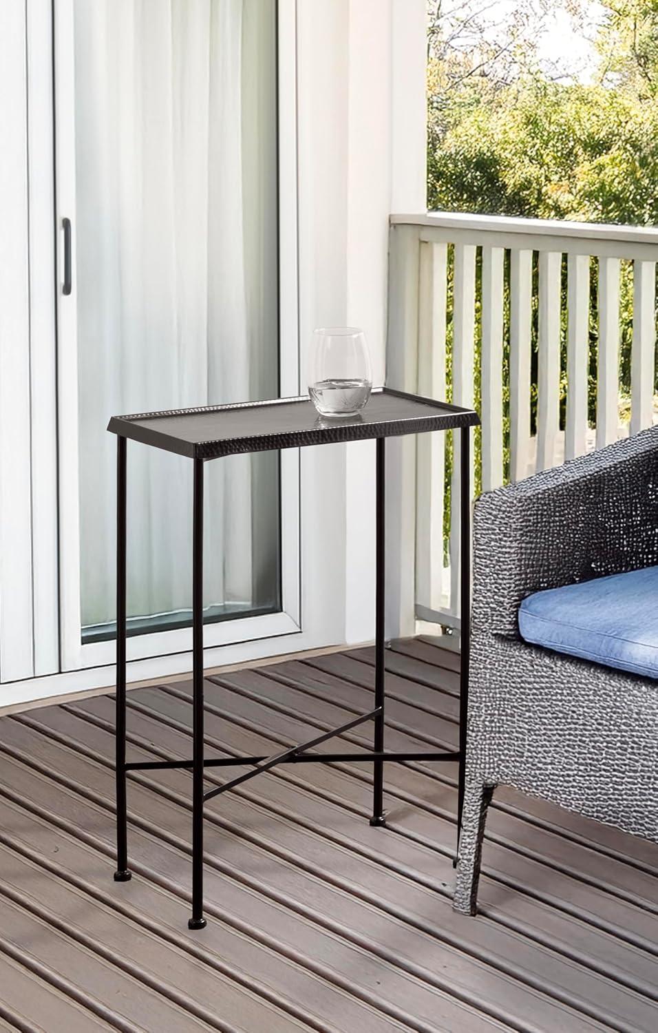 For the interior decorator with a passion for modern design comes our Sanzo narrow side table. The Sanzo collection features a solid iron construction with a hand-applied hammered texture crafted by artisans in India. Each table stands at 24 inches tall, ideal for placement next to your living room couch or bed. The tabletop's surface area is a perfect display or storage area for lamps, morning coffee, plants, alarm clocks, or other small items. Use it as a living room table, a slim nightstand in the bedroom, or an accent table near your bathtub. Regardless of where you put it, the Sanzo end table makes for a unique statement piece in any area of your modern home. Everything down to the outdoor-grade glossy black finish echoes timeless design and style. You won't have to work hard to set up this charming table, either; the Sanzo side table has a simple, three-step assembly process. The 16.5-inch width and 8.5-inch depth make this a charming indoor or outdoor plant stand option for some small succulents or your favorite house plant.
