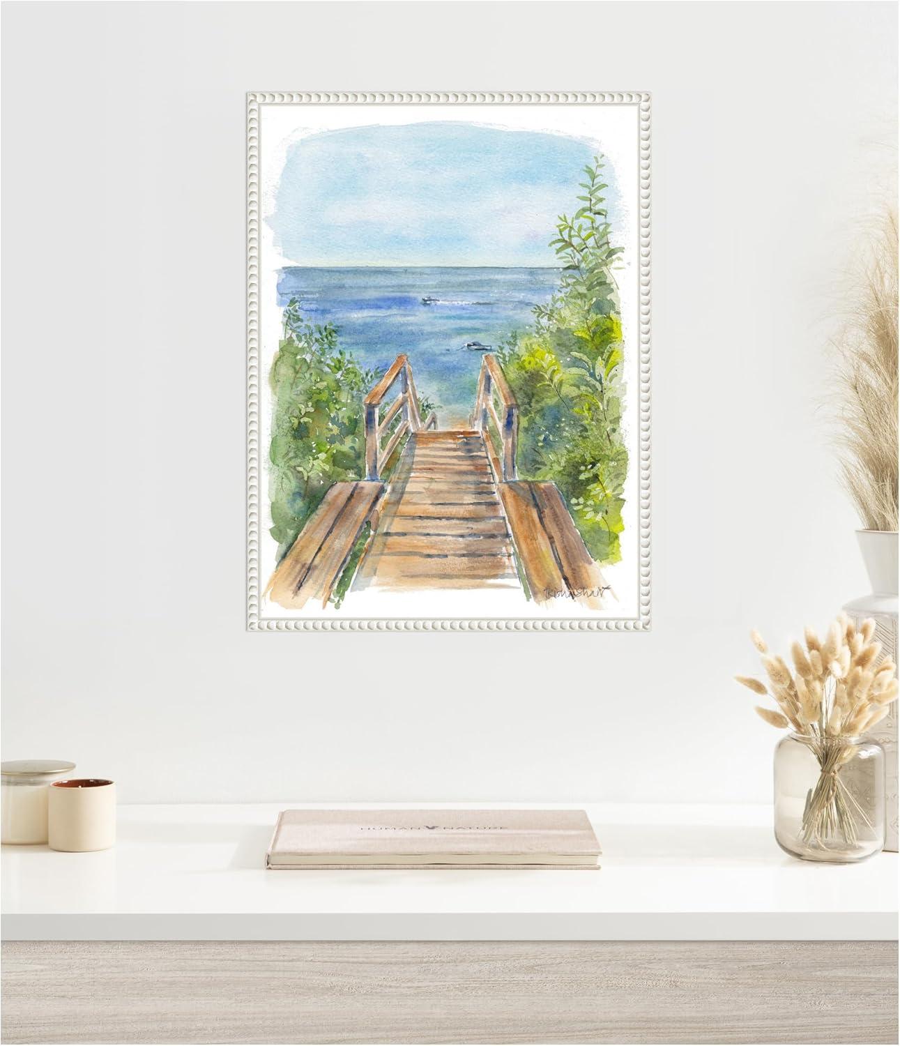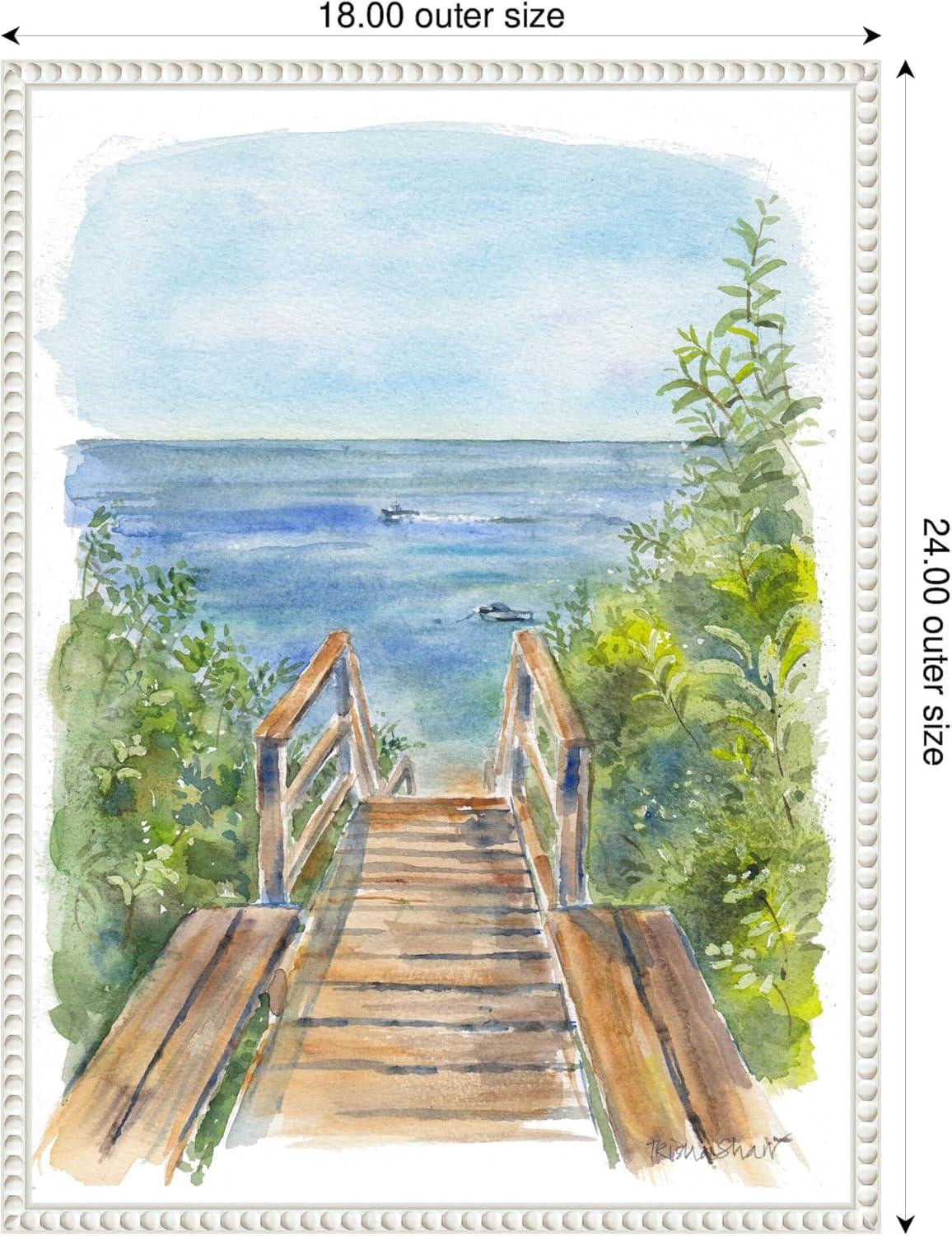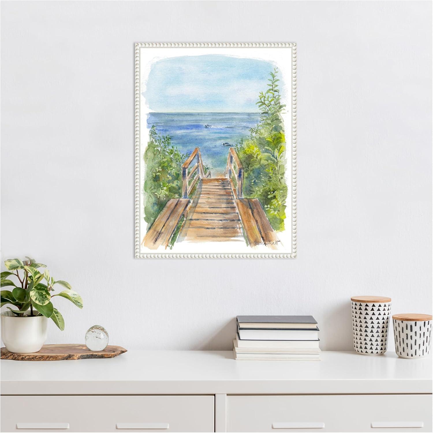 Kate and Laurel Stariway to Beach Cape Cod Framed Canvas Wall Art by Patricia Shaw 18 x 24 Sylvie Beaded White, Coastal, Beach, Landscapes, Nature Art for Wall Decor, Living Room, Bedroom