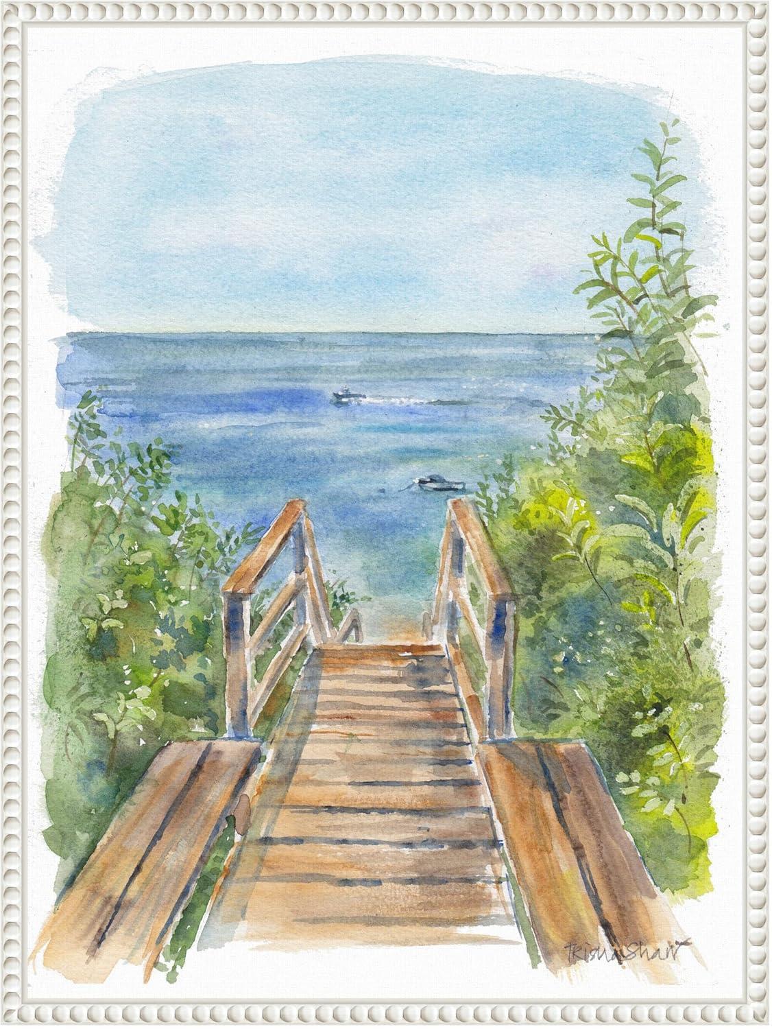 Art Description: The artwork depicts a wooden pathway leading down to a serene ocean, framed by lush greenery. The watercolor technique captures the gentle waves and distant boats on the water. The overall feel is peaceful and inviting, evoking a sense of summer relaxation by the coast.