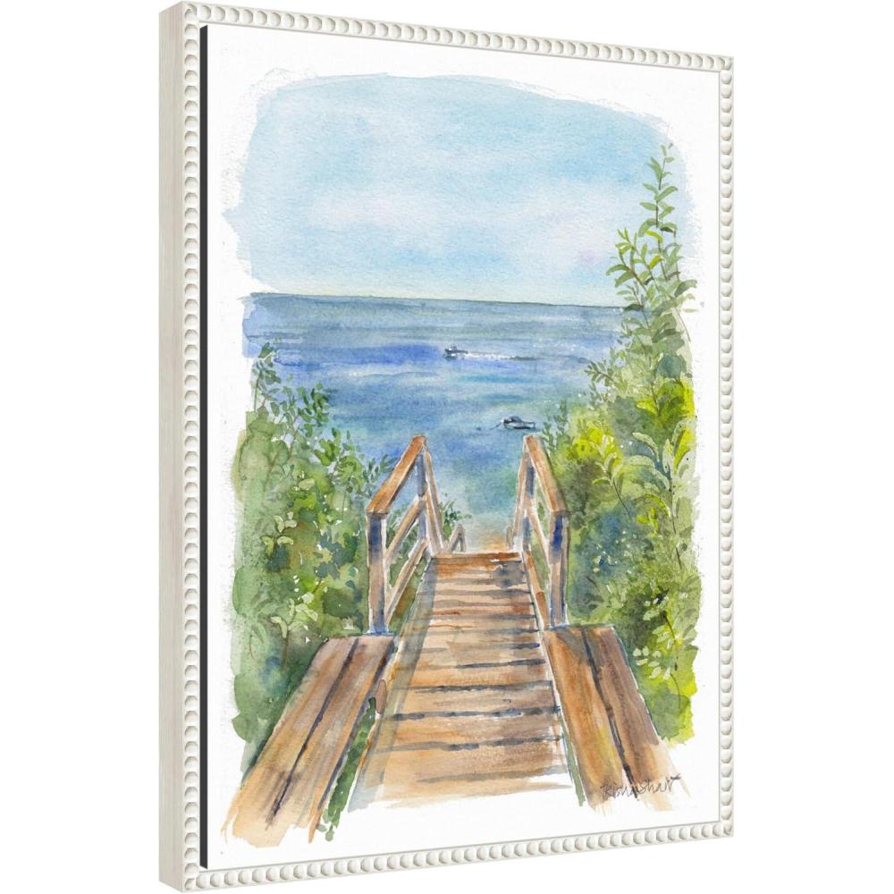 The artwork depicts a wooden pathway leading down to a serene ocean, framed by lush greenery. The watercolor technique captures the gentle waves and distant boats on the water. The overall feel is peaceful and inviting, evoking a sense of summer relaxation by the coast. This Kate and Laurel canvas art print was created by Patricia Shaw and printed by Kate and Laurel in Waunakee WI. This modern floating canvas art is sure to bring joy to your space. Our design team curates art that will fit perfectly in any room of your home. Showcase this art in your living room, bedroom, home office, kitchen, bathroom, nursery, or anywhere you want to bring a little beauty and charm to your walls. Specializing in home decor, we are continually bringing timeless works of art for the traditional decorator as well as trend-forward pieces for that eclectic art lover. Our high-quality framed canvas art also makes excellent gifts for birthdays, holidays, or housewarming parties. Printed on gallery-wrapped canvas and framed with a simple gallery frame this wall art is easy to display on the wall and will match with any decor style. The outside display dimensions are 18 in x 24 in by 1.6 in Print Name: “Stariway to Beach Cape Cod”