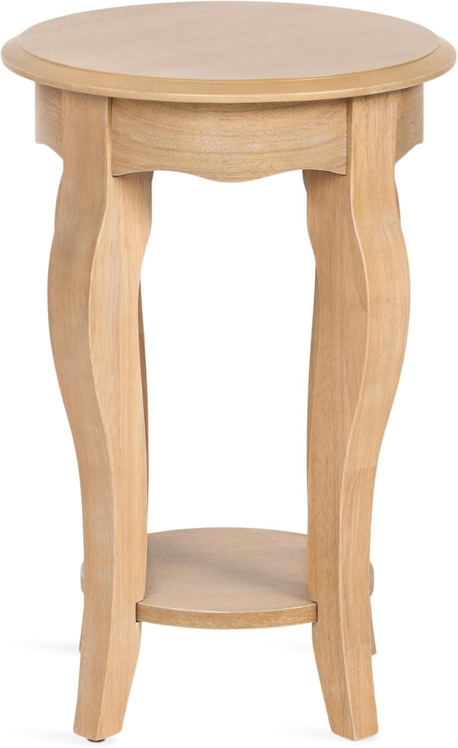 Showcase your traditional-inspired style with the Sutherlin side table from Kate and Laurel. The light and elegant finish of the table adds a touch of sophistication to any space, while the classic nature of the design adds character to your home. Between its curved cabriole legs and its wavy table apron, the unique details of this table are on full display. The light natural wood finish also lends itself to organic modern design, giving it that look of transitional, timeless decor. A careful blend of solid wood and resilient wooden material was used to create this beautiful side table, creating a statement that is as durable as it is beautiful. Its overall dimensions are 16 inches in diameter with a height of 24.25 inches, allowing the Sutherlin to function well in small corners, next to a bed, near an entryway, or paired with living room furniture. The top wooden tier is perfect for creating a lovely display area for candles, small lamps, and other accents. The bottom tier of the Sutherlin is great for storing your favorite household accessories, from small blankets to lush faux greenery. Assemble this table in only a matter of minutes with a straightforward, two-step assembly process.