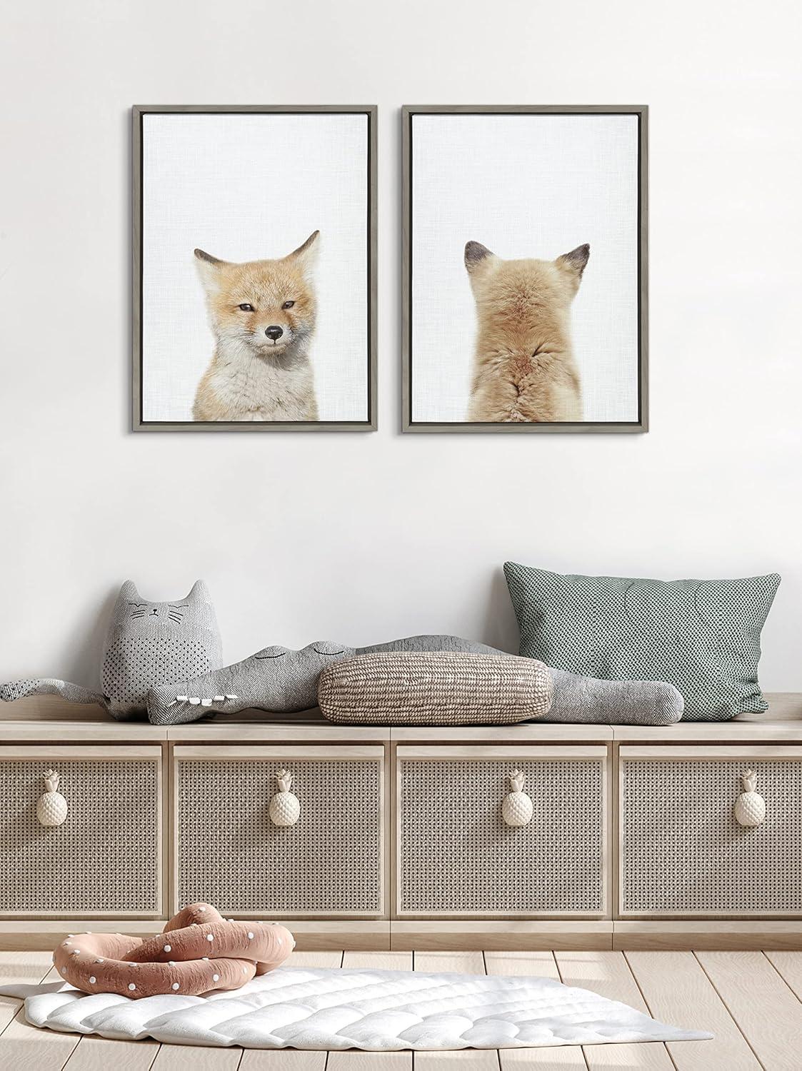 Kate and Laurel Sylvie Baby Fox Front and Back Framed Canvas Wall Art Set by Amy Peterson Art Studio, 2 Piece Set 18x24 Gray, Decorative Adorable Animal Art Set Wall Décor