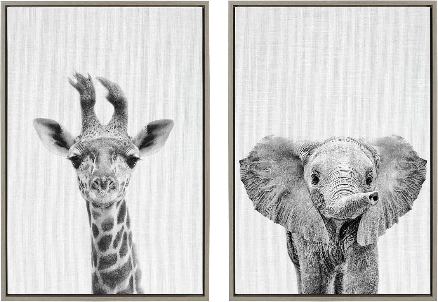Kate and Laurel Sylvie Baby Giraffe and Elephant Framed Canvas Wall Art Set by Simon Te of Tai Prints, 2 piece 18×24 Natural, Modern Nature Animals Art for Wall Home Decor(Gray)