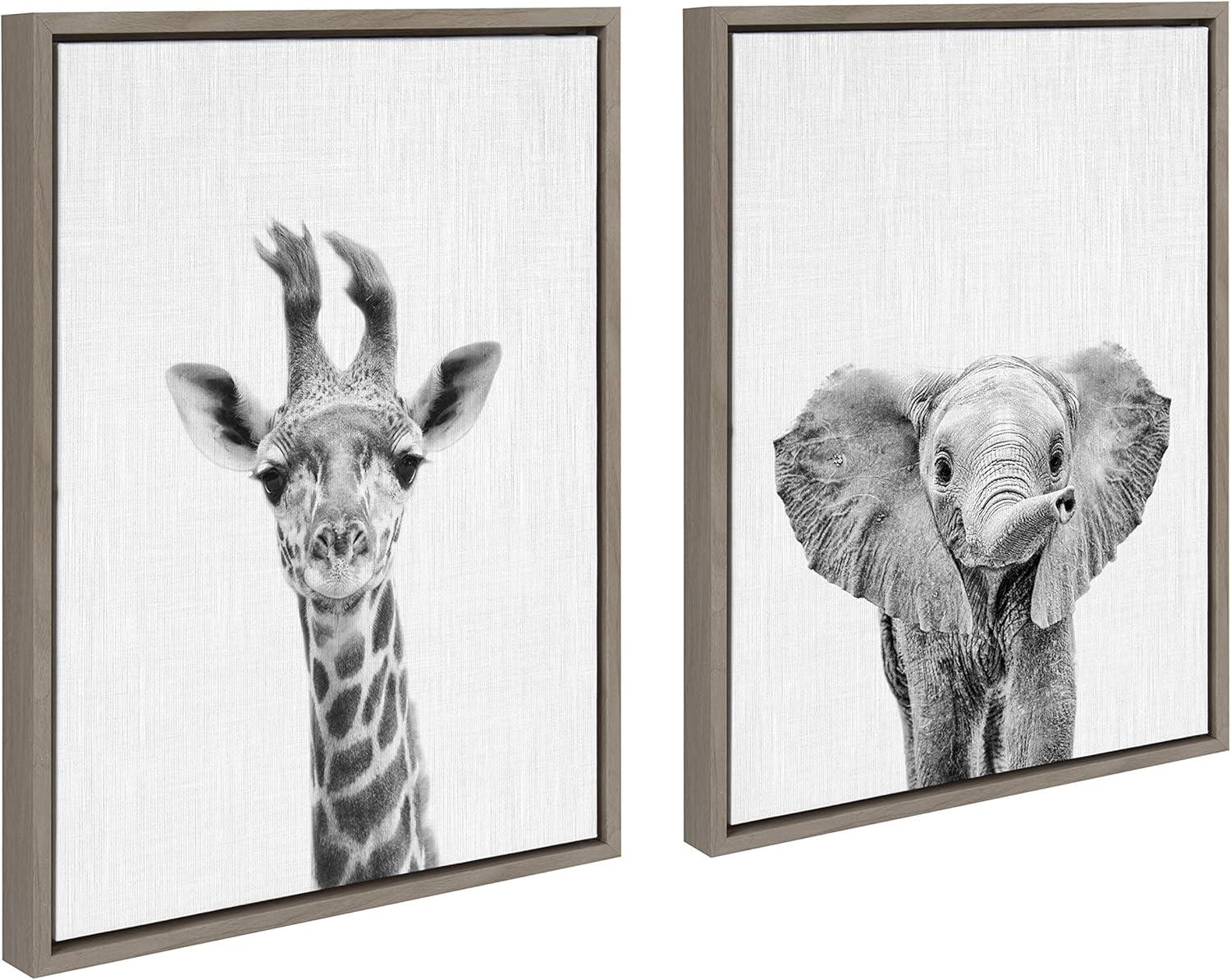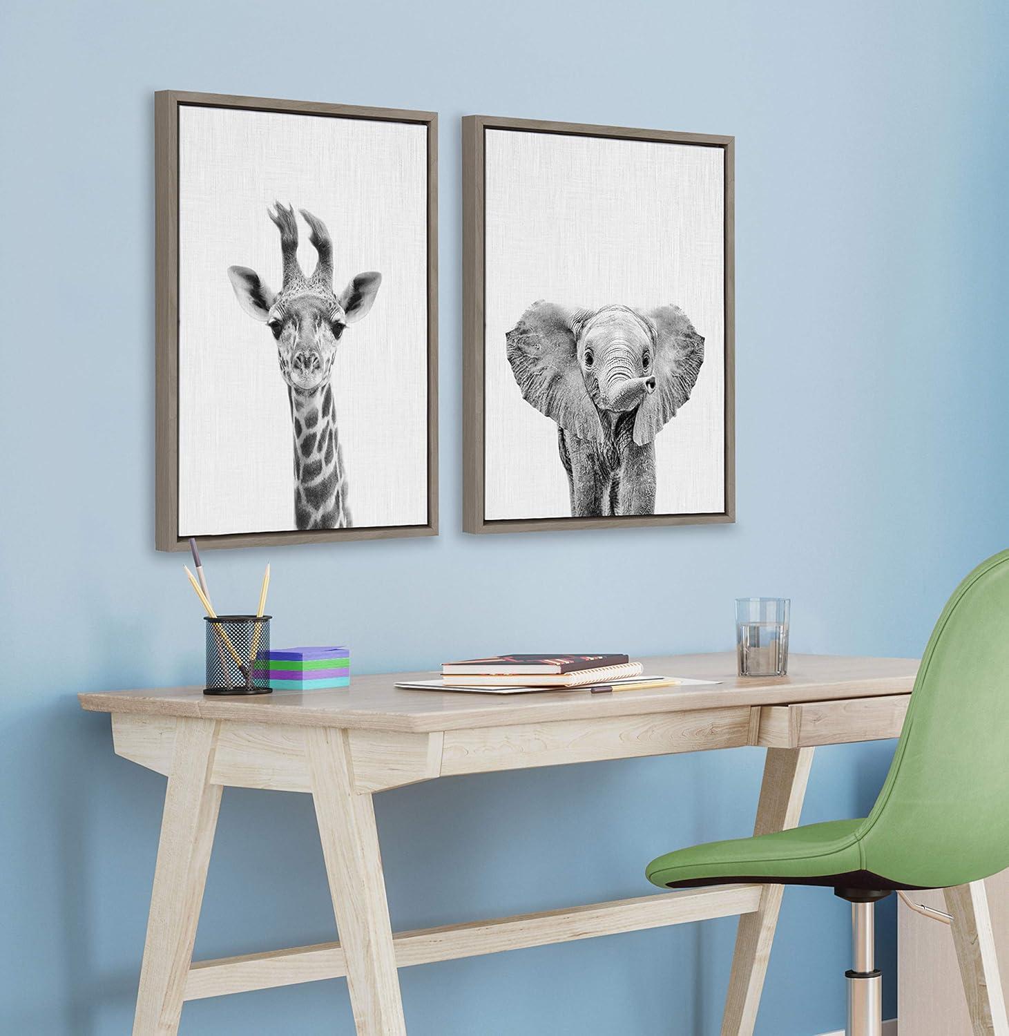 Kate and Laurel Sylvie Baby Giraffe and Elephant Framed Canvas Wall Art Set by Simon Te of Tai Prints, 2 piece 18x24 Natural, Modern Nature Animals Art for Wall Home Decor(Grey)