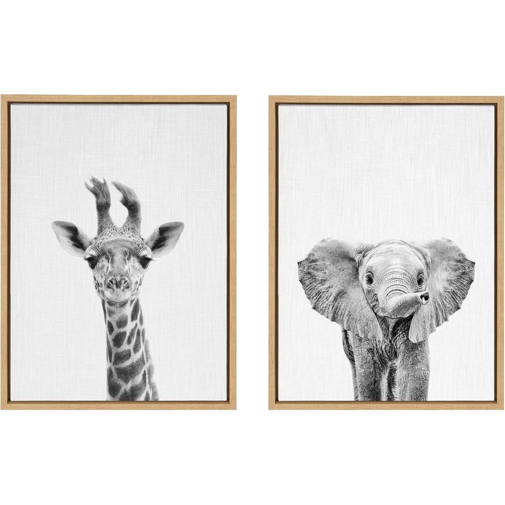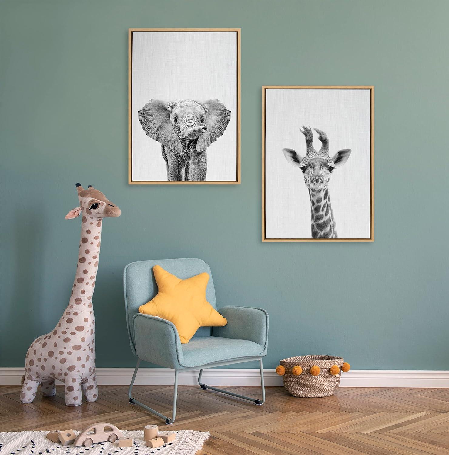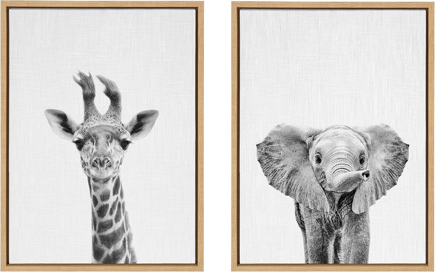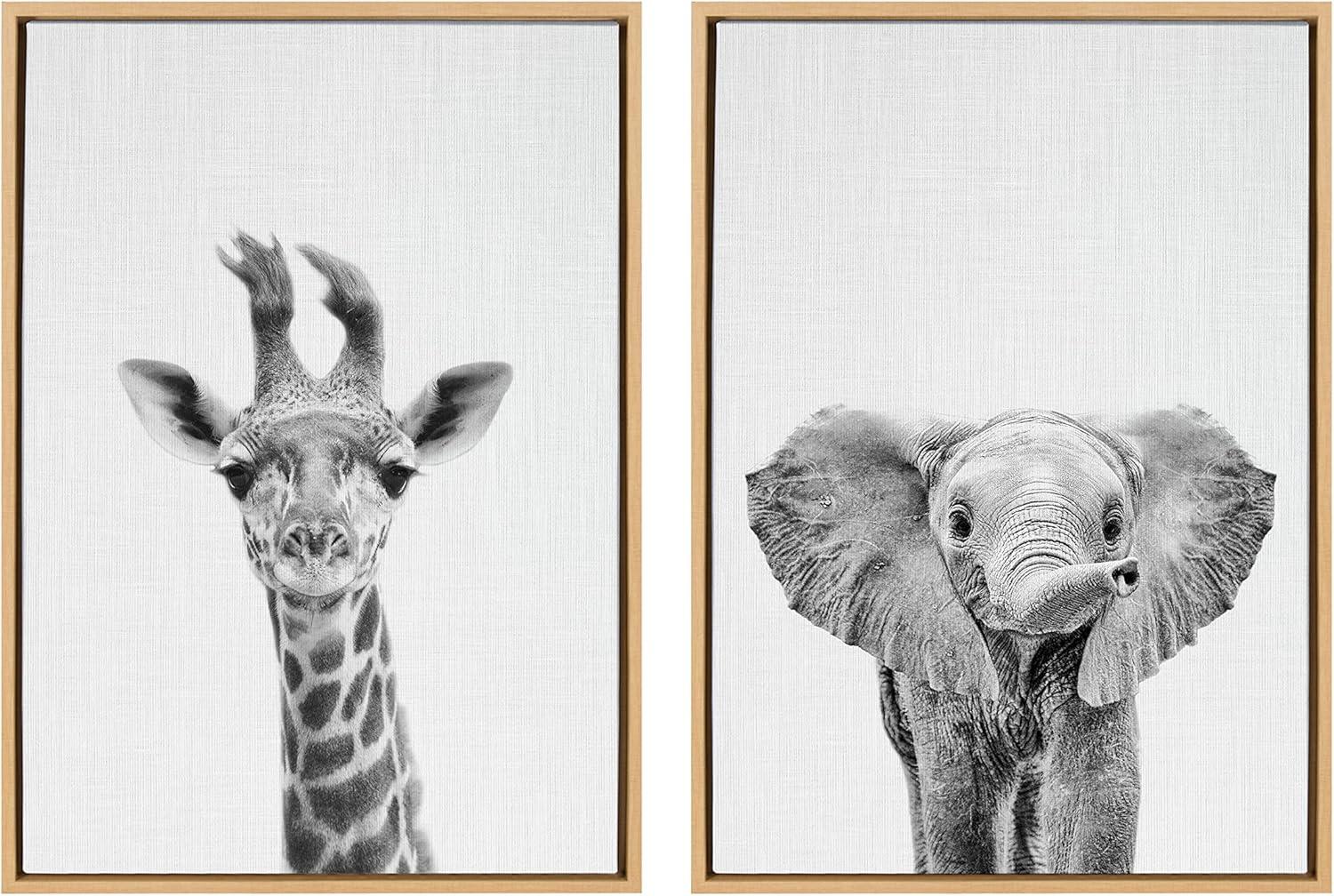 Show your love of nature and the friendly animals of the jungle with this framed canvas art set by Simon Te of Tai Prints. Displayed in a sleek modern frame, this fun, contemporary design is the perfect art piece to add to your home decor collection. Framed in the USA in Waunakee, Wisconsin, this floating canvas art set of 2 will be a pleasure to look at every day in your living room, bedroom, nursery, or any room in the home. This art print also makes an excellent gift for birthdays, holidays, or house-warming parties. Printed on gallery-wrapped canvas and framed with a lightweight polystyrene frame, this wall art is easy to display on the wall. The outer dimensions are 18 inches by 24 inches by 1.6 inches. Print Name: “Baby Giraffe and Elephant”