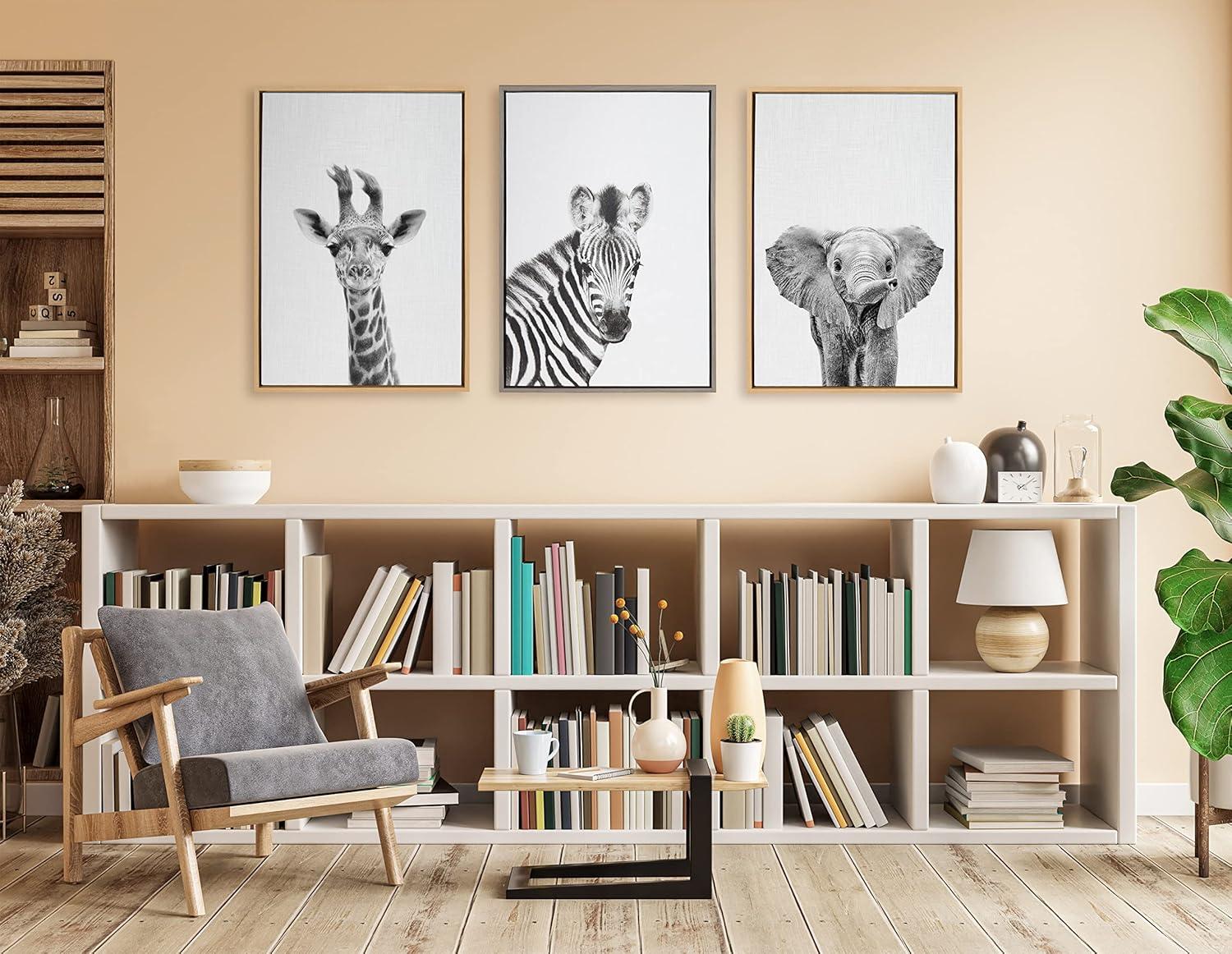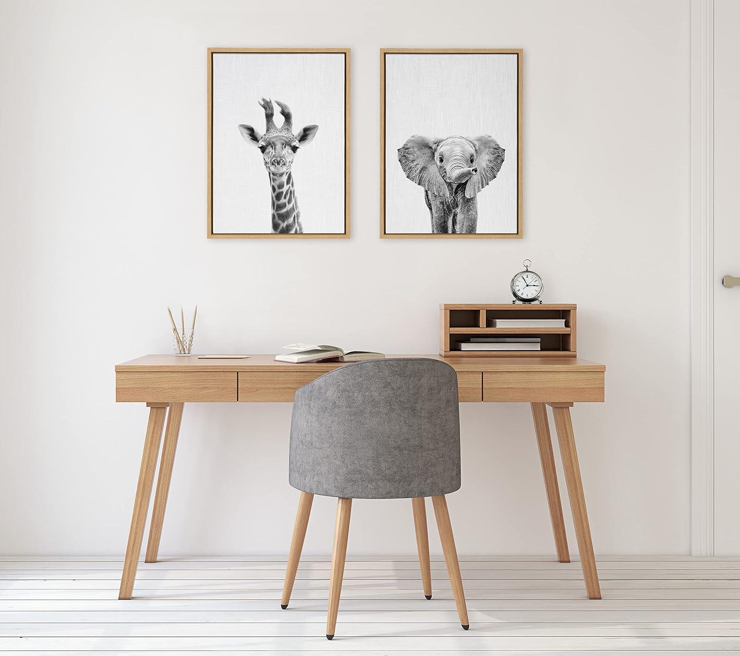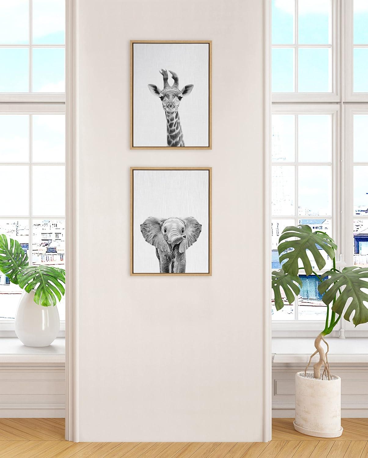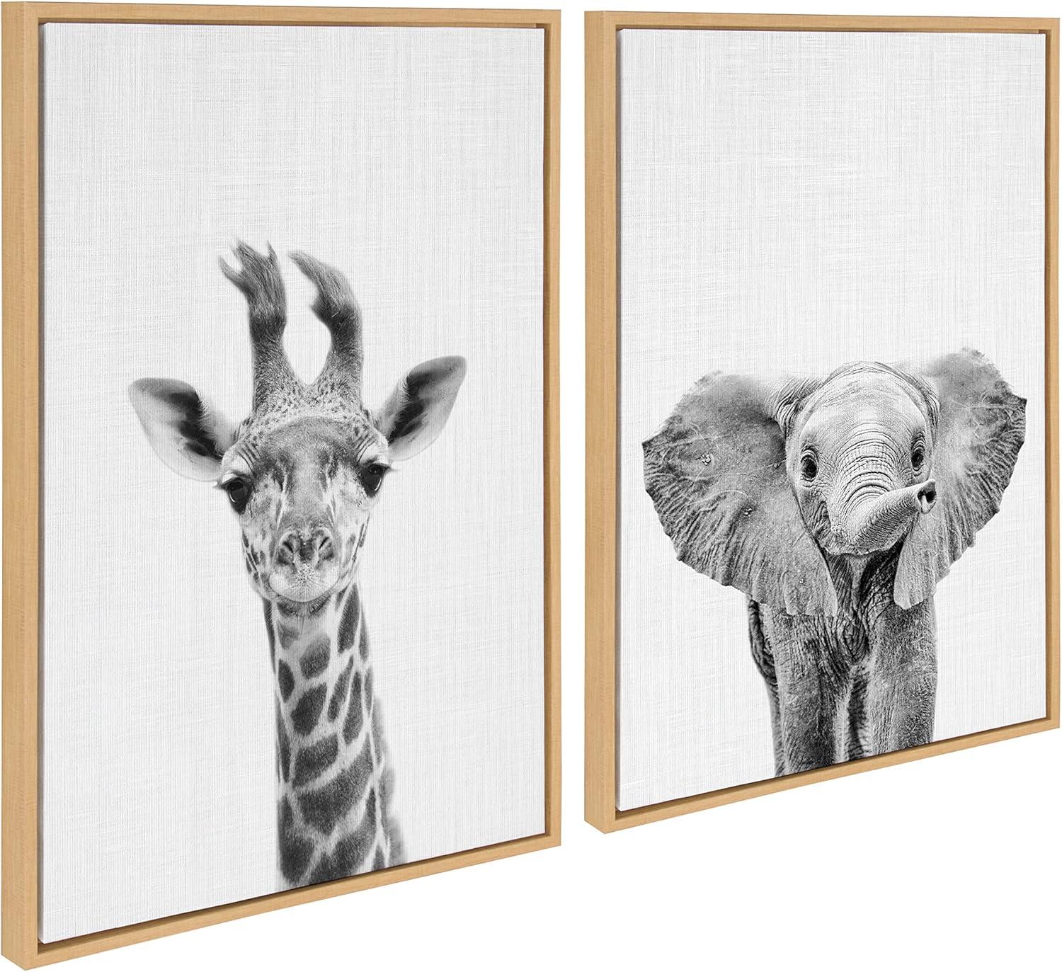 Show your love of nature and the friendly animals of the jungle with this framed canvas art set by Simon Te of Tai Prints. Displayed in a sleek modern frame, this fun, contemporary design is the perfect art piece to add to your home decor collection. Framed in the USA in Waunakee, Wisconsin, this floating canvas art set of 2 will be a pleasure to look at every day in your living room, bedroom, nursery, or any room in the home. This art print also makes an excellent gift for birthdays, holidays, or house-warming parties. Printed on gallery-wrapped canvas and framed with a lightweight polystyrene frame, this wall art is easy to display on the wall. The outer dimensions are 18 inches by 24 inches by 1.6 inches. Print Name: “Baby Giraffe and Elephant”