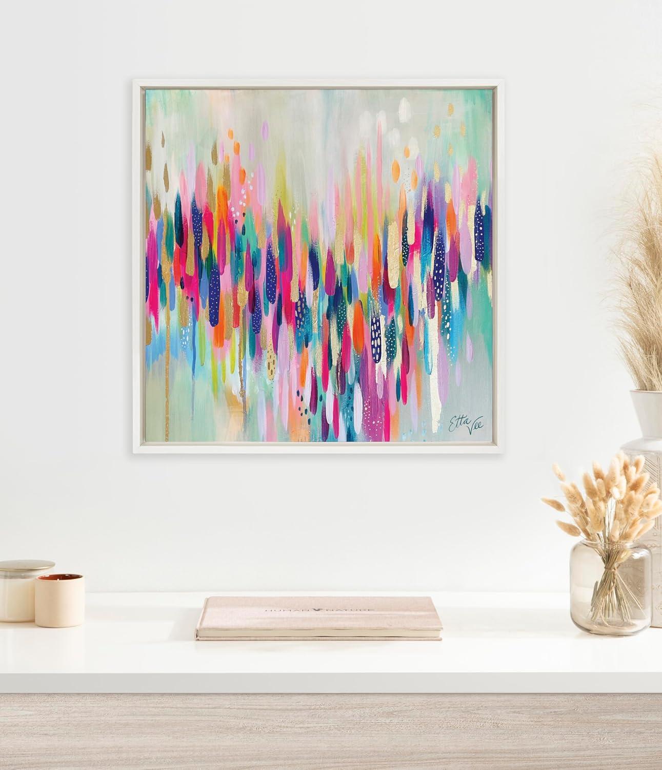 Transform your space with this bright, abstract wall art piece by Jessi Raulet of Ettavee. Its lovely, colorful brushstrokes provide your space with a needed addition of creativity and energy. Framed in the USA in Waunakee, Wisconsin, this modern floating canvas art is sure to bring joy to your space. Our design team curates art that will fit perfectly in any room of your home. Showcase this art in your living room, bedroom, home office, kitchen, bathroom, nursery, or anywhere you want to bring a little beauty and charm to your walls. Specializing in home décor, we are continually bringing timeless works of art for the traditional decorator as well as trend-forward pieces for that eclectic art lover. Our high-quality framed canvas art also makes excellent gifts for birthdays, holidays, or housewarming parties. Printed on gallery-wrapped canvas and framed with a simple gallery frame this wall art is easy to display on the wall and will match with any décor style. The outer dimensions are 22 inches by 22 inches by 1.6 inches. Print Name: “Brushstroke 154”