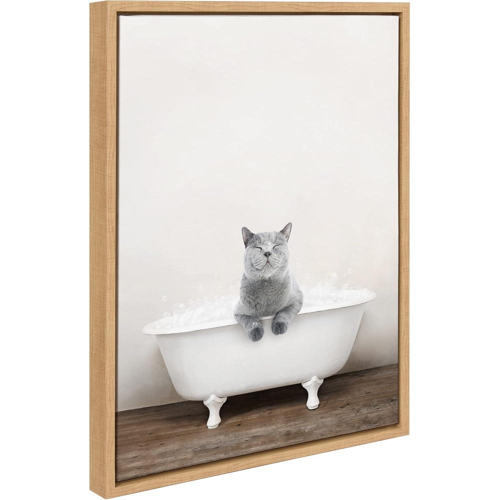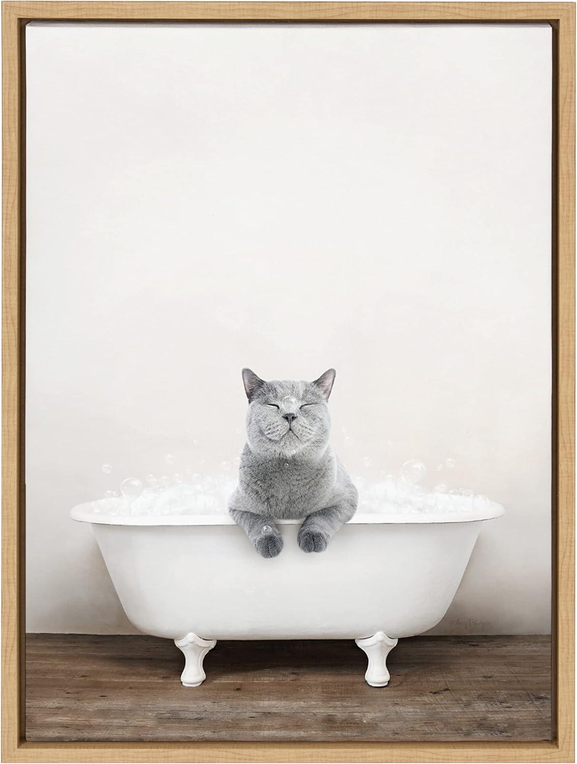 Kate and Laurel Sylvie Cat in Rustic Bath Framed Canvas Wall Art by Amy Peterson Art Studio; 18×24 Gray; Modern Fun Decorative Bathtub Wall Art for Home Décor(Natural)