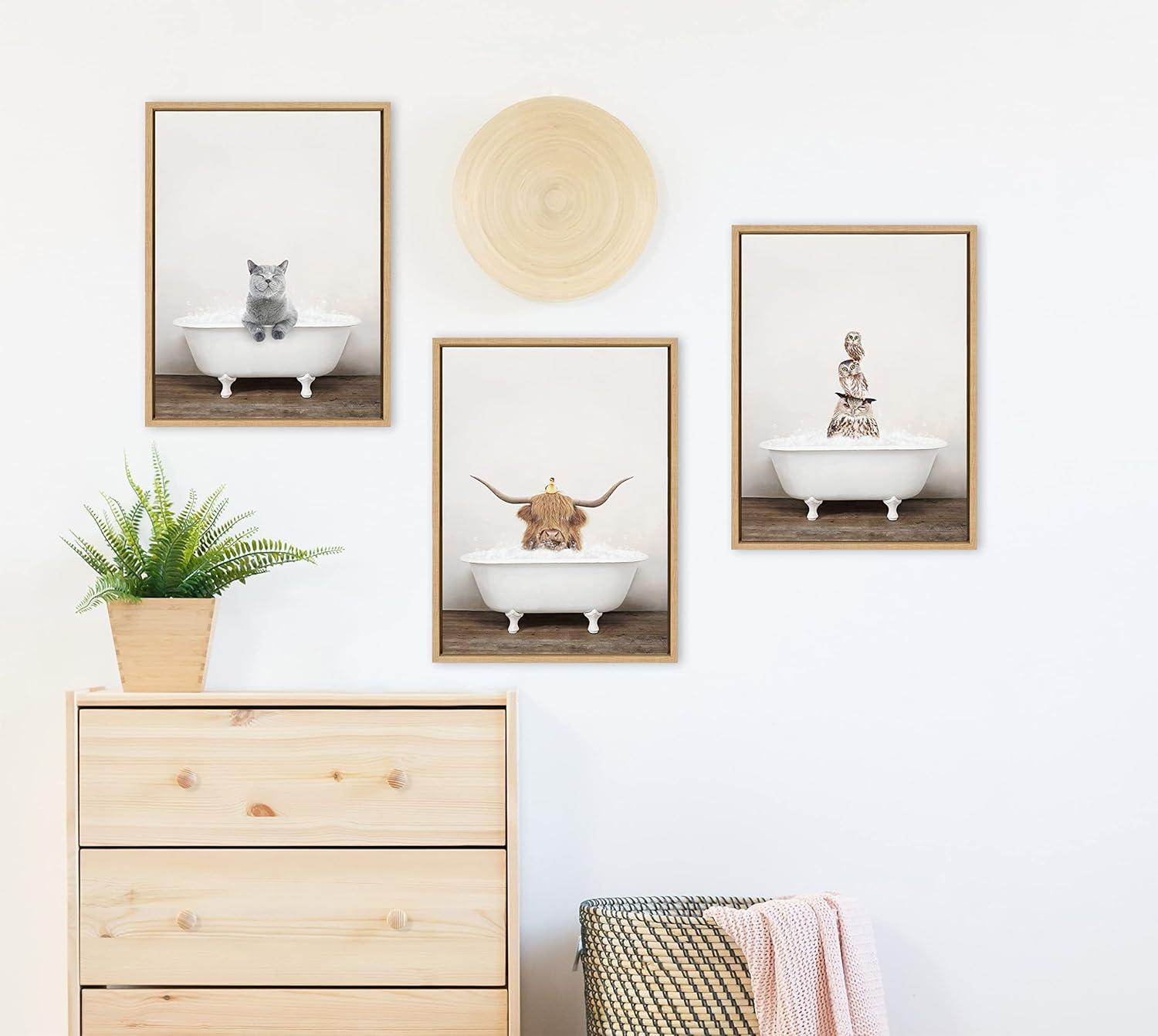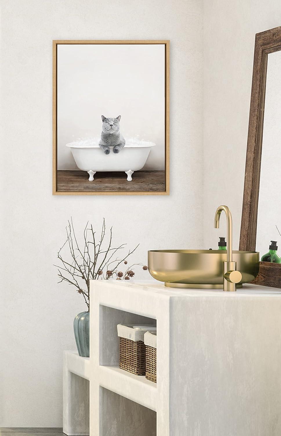 Kate and Laurel Sylvie Cat in Rustic Bath Framed Canvas Wall Art by Amy Peterson Art Studio; 18x24 Gray; Modern Fun Decorative Bathtub Wall Art for Home Décor(Natural)