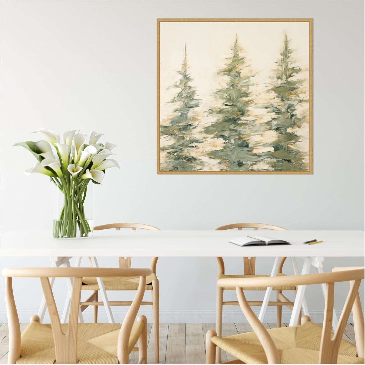 This artwork portrays an abstract interpretation of three evergreen trees. The trees are depicted using impressionistic brushstrokes in shades of green, giving a sense of movement and depth. The light background contrasts with the trees, enhancing their prominence. This Kate and Laurel canvas art print was created by The Creative Bunch Studio and printed by Kate and Laurel in Waunakee WI. This modern floating canvas art is sure to bring joy to your space. Our design team curates art that will fit perfectly in any room of your home. Showcase this art in your living room, bedroom, home office, kitchen, bathroom, nursery, or anywhere you want to bring a little beauty and charm to your walls. Specializing in home decor, we are continually bringing timeless works of art for the traditional decorator as well as trend-forward pieces for that eclectic art lover. Our high-quality framed canvas art also makes excellent gifts for birthdays, holidays, or housewarming parties. Printed on gallery-wrapped canvas and framed with a simple gallery frame this wall art is easy to display on the wall and will match with any decor style. The outside display dimensions are 30 in. w x 30 in. h by 1.6 in. Print Name: “Evergreen Trees Abstract”
