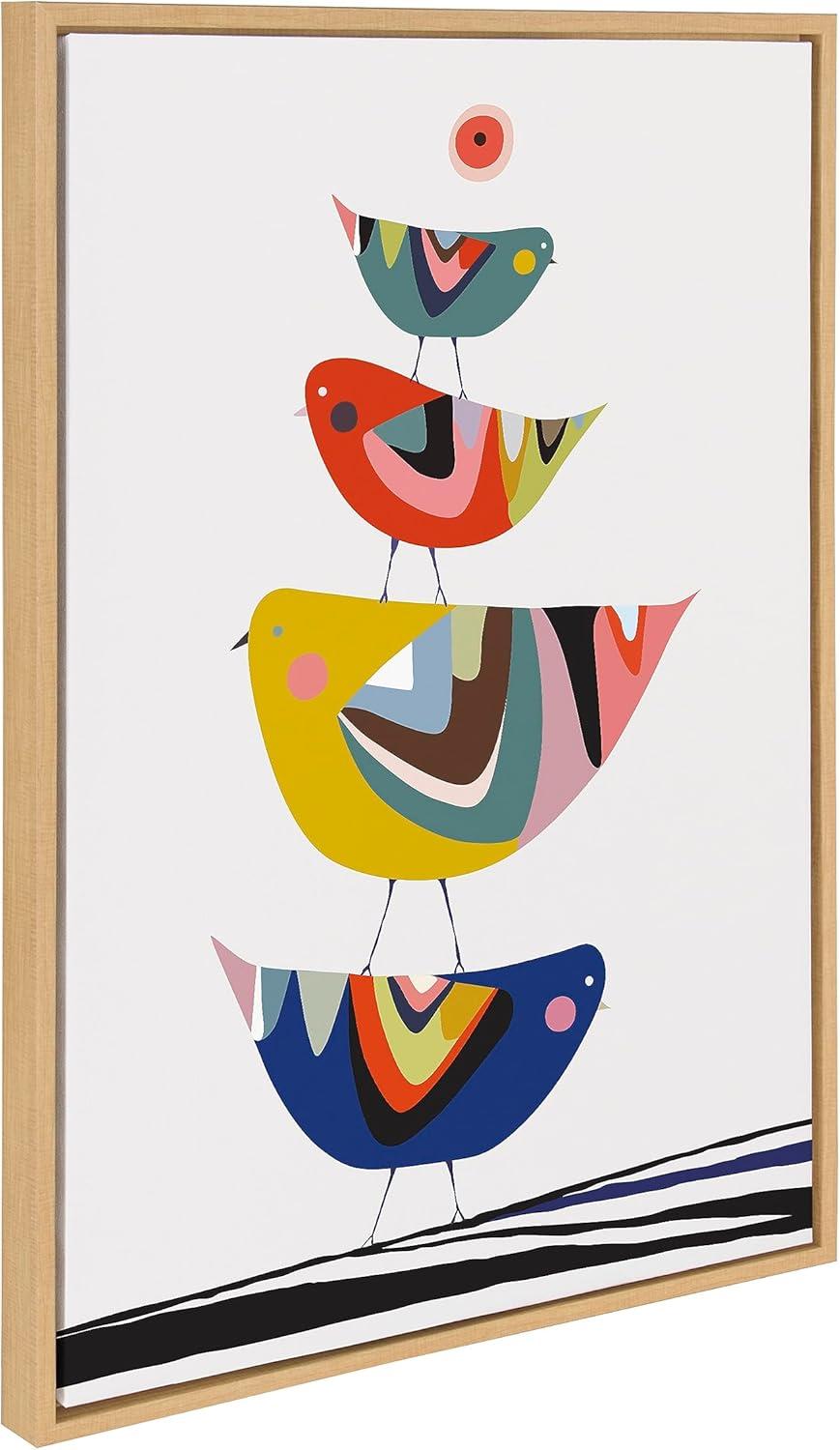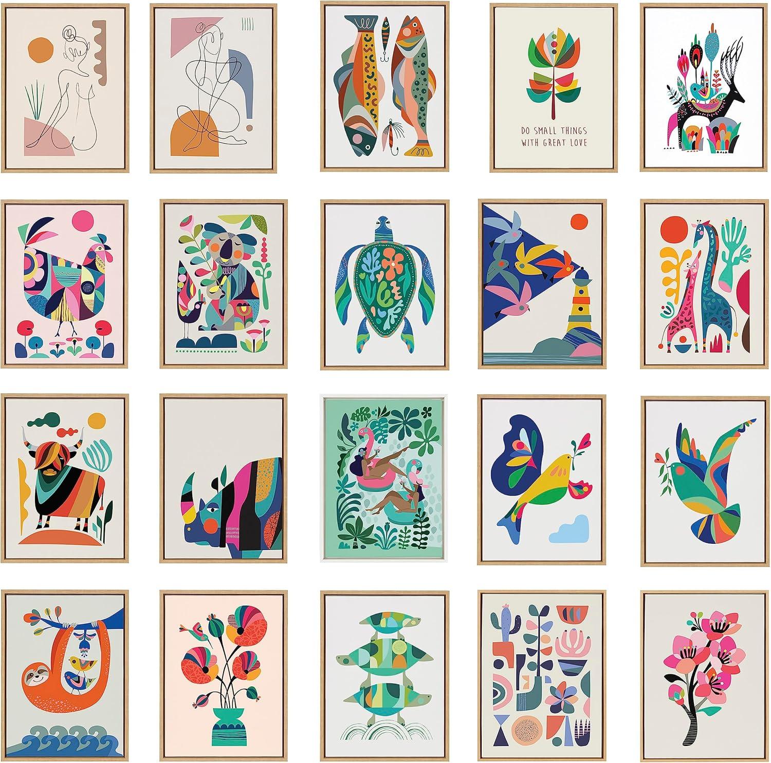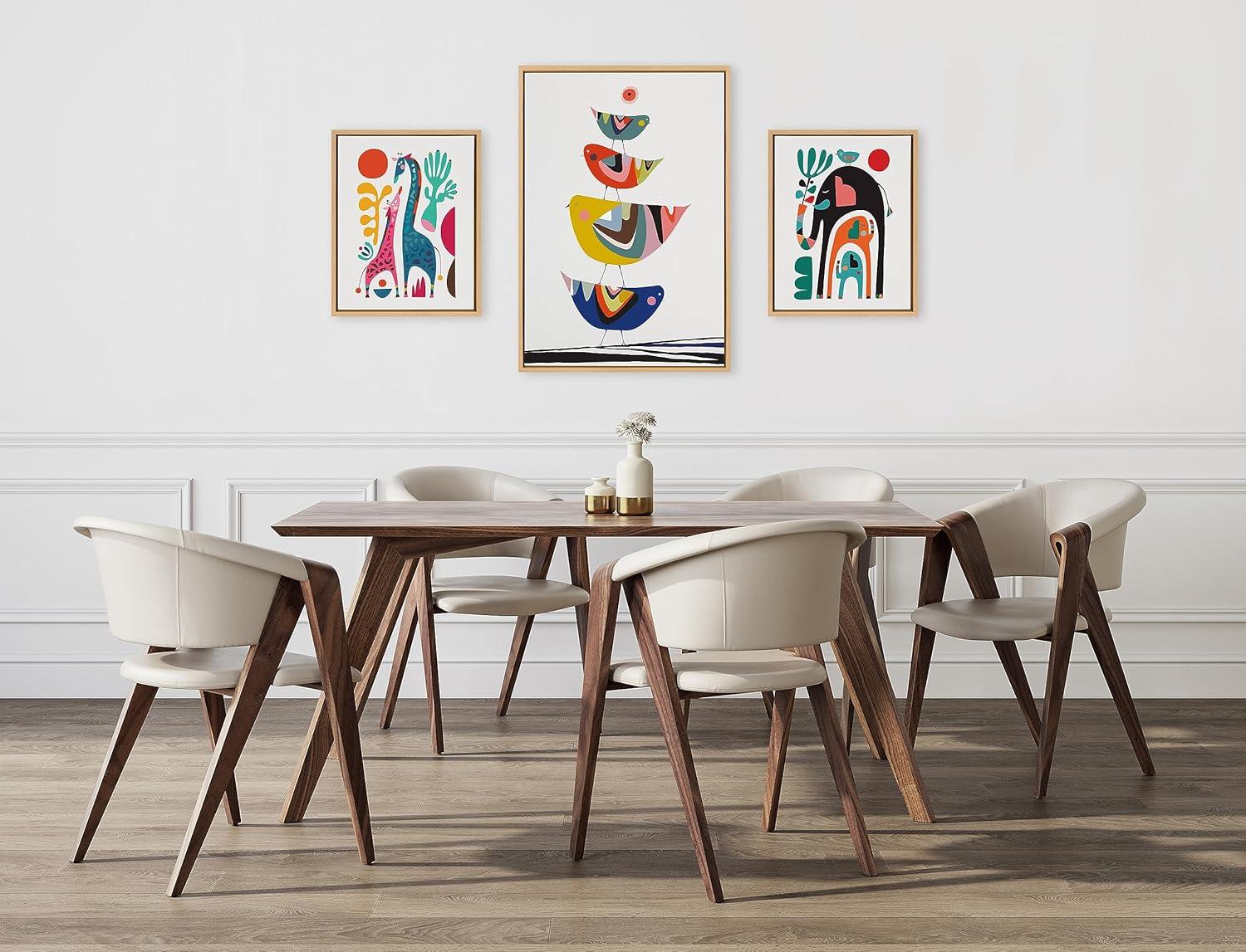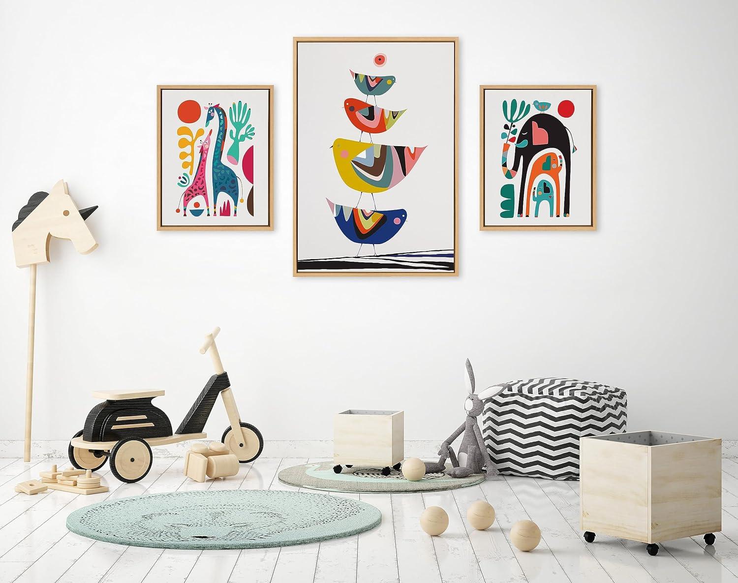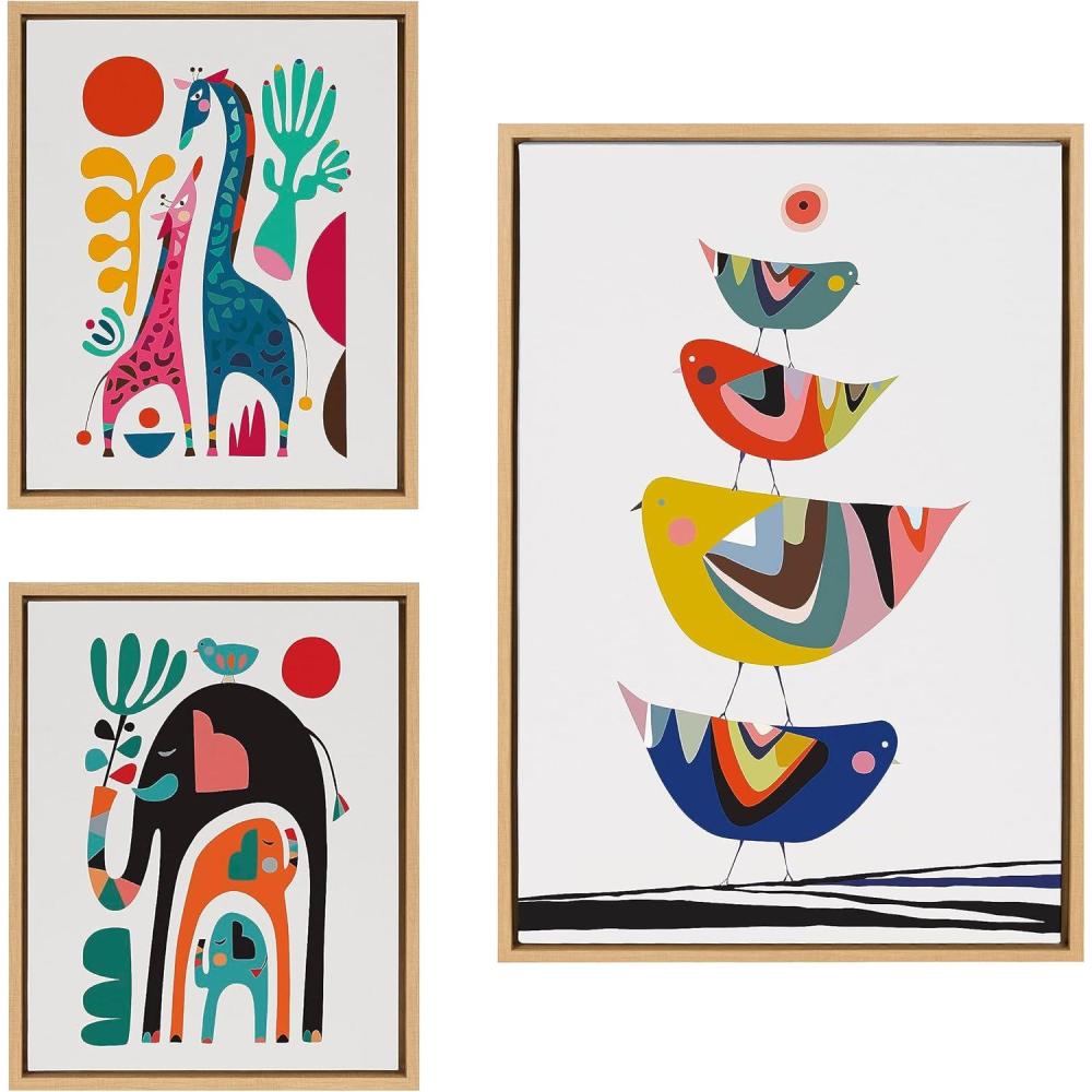 Rachel Lee's “Family Tree” set showcases adorable animals in a colorful mid-century style. With birds, giraffes, and elephants, this artwork set brings a heartwarming and nostalgic touch to your wall. Framed in the USA in Waunakee, Wisconsin, this modern floating canvas art set of 3 is sure to bring joy to your space. Our design team curates art that will fit perfectly in any room of your home. Showcase this art in your living room, bedroom, home office, kitchen, bathroom, nursery, or anywhere you want to bring a little beauty and charm to your walls. Specializing in home décor, we are continually bringing timeless works of art for the traditional decorator as well as trend-forward pieces for that eclectic art lover. Our high-quality framed canvas art also makes excellent gifts for birthdays, holidays, or housewarming parties. Printed on gallery-wrapped canvas and framed with a simple gallery frame this wall art is easy to display on the wall and will match with any décor style. Display dimensions of the largest piece are 23 inches by 33 inches and the two smaller canvases are each 16 inches by 20 inches. Print Names: “Family Tree 4 Birds, Giraffe Love and Three Elephants”