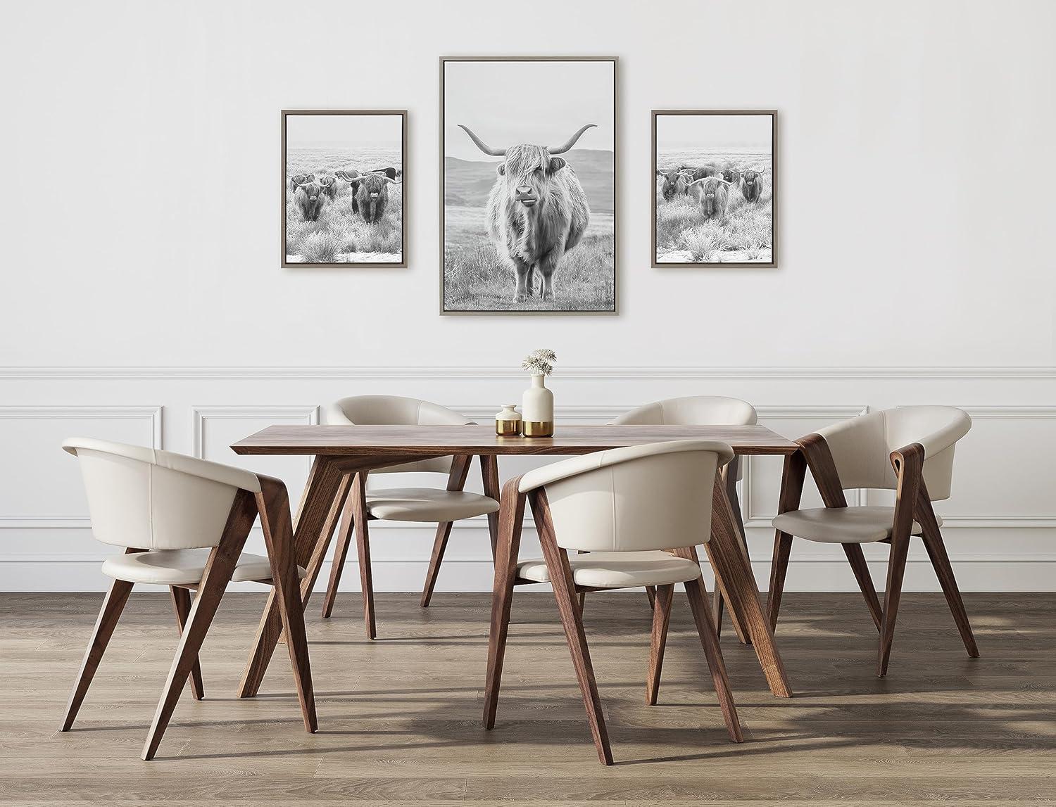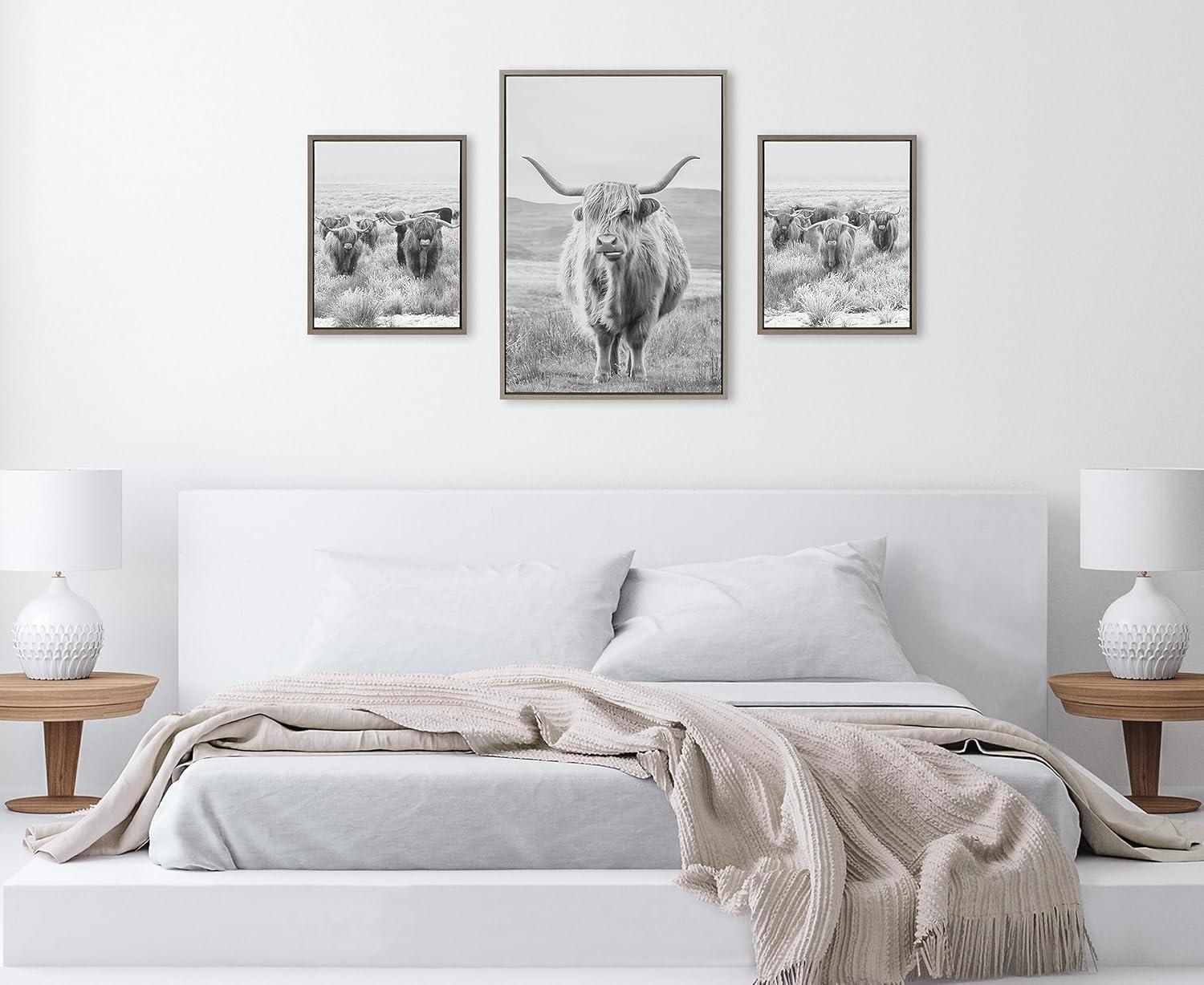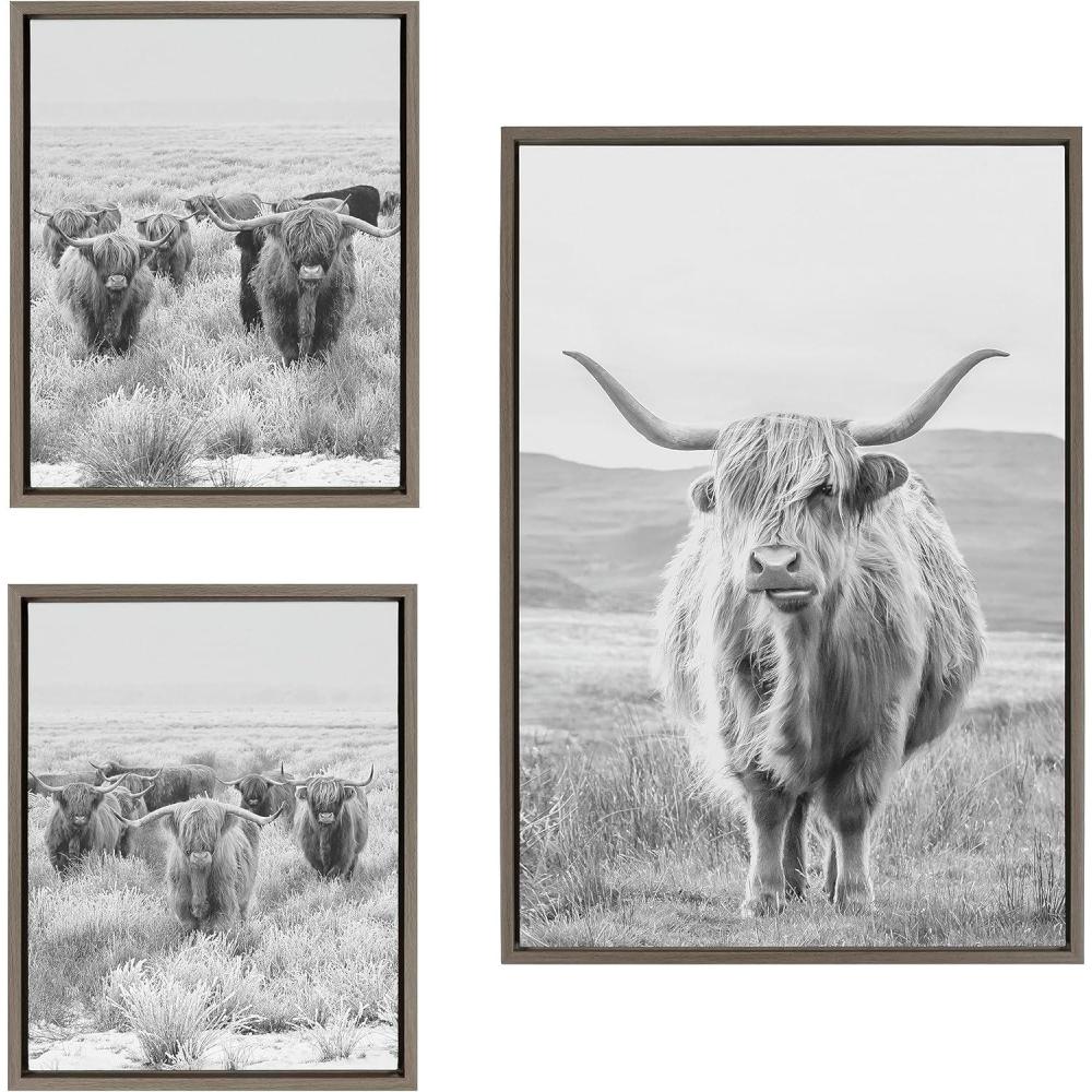 Capture the rustic allure of farm life with this framed canvas art set. It features majestic Highland cows and a serene mountain landscape that evoke a sense of pastoral tranquility. Framed in the USA in Waunakee, Wisconsin, this modern floating canvas art set of 3 is sure to bring joy to your space. Our design team curates art that will fit perfectly in any room of your home. Showcase this art in your living room, bedroom, home office, kitchen, bathroom, nursery, or anywhere you want to bring a little beauty and charm to your walls. Specializing in home décor, we are continually bringing timeless works of art for the traditional decorator as well as trend-forward pieces for that eclectic art lover. Our high-quality framed canvas art also makes excellent gifts for birthdays, holidays, or housewarming parties. Printed on gallery-wrapped canvas and framed with a simple gallery frame this wall art is easy to display on the wall and will match with any décor style. Display dimensions of the largest piece are 23 inches by 33 inches and the two smaller canvases are each 16 inches by 20 inches. Print Names: “Herd of Highland Cows BW Left and Right and Highland Cow Mountain Landscape Black and White”