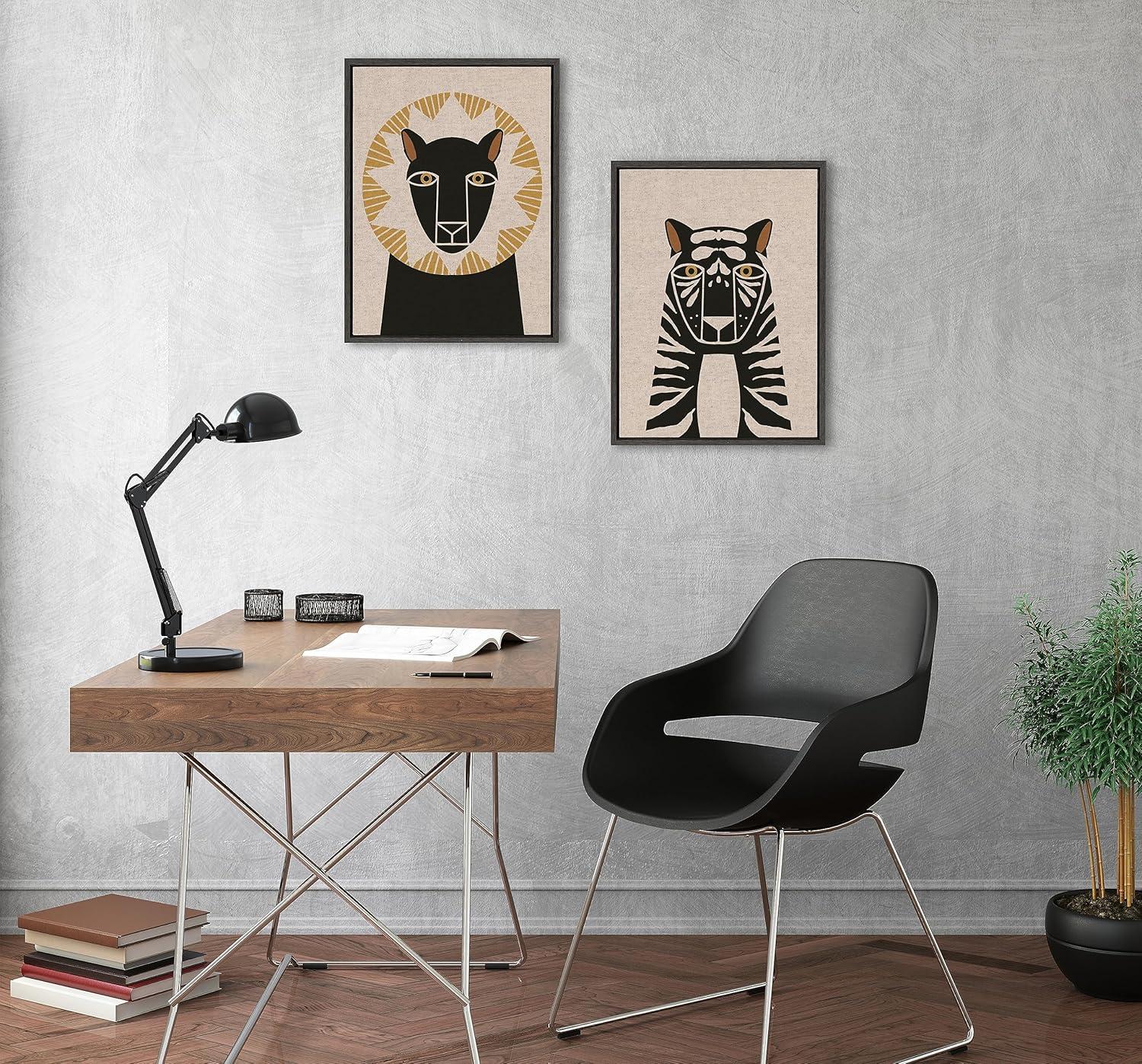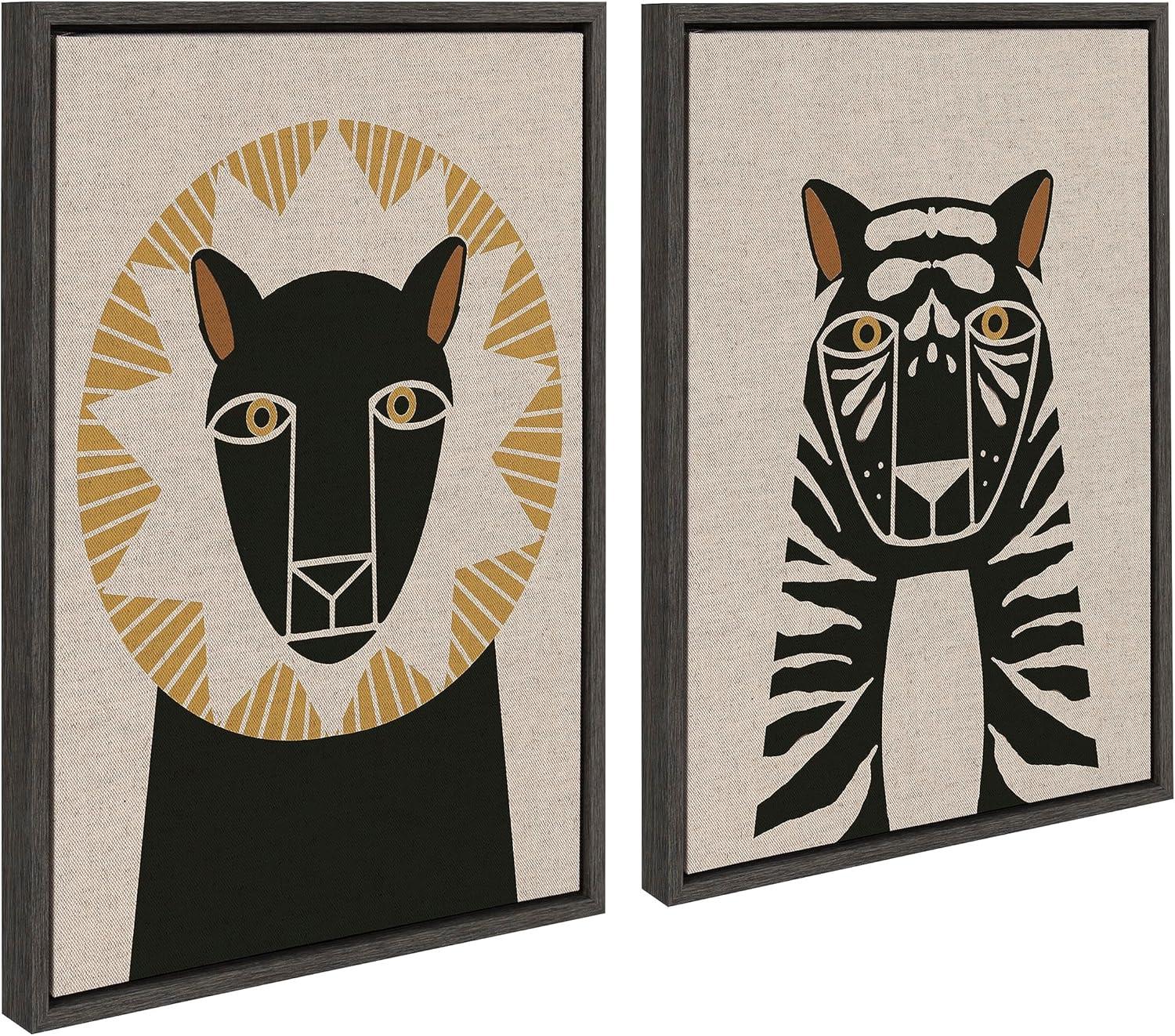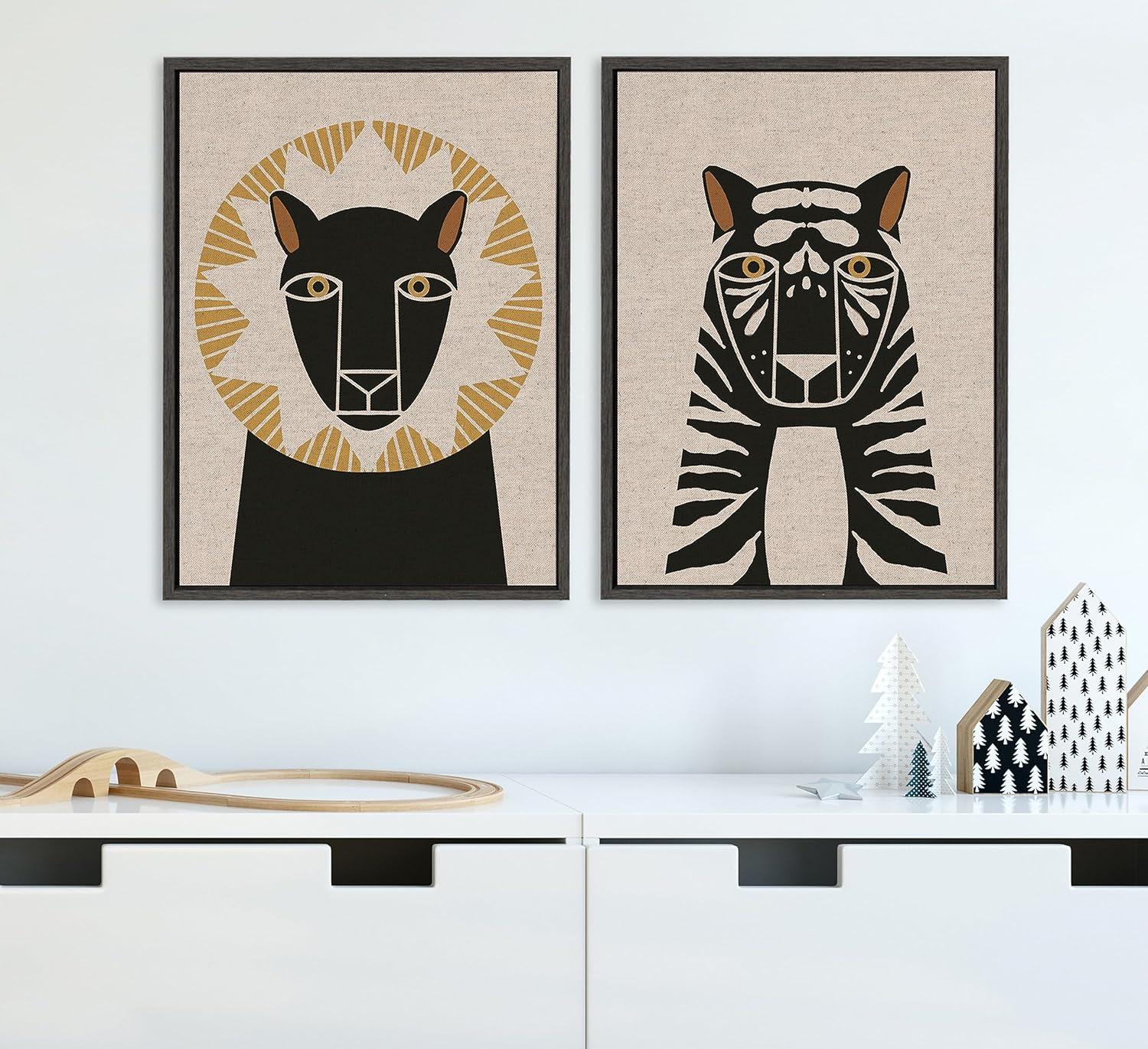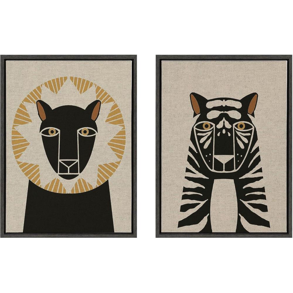 Fill your space with a charming lion and tiger illustration art set from Hannah Beisang. This neutral linen set is great for that friend of yours who is a big animal lover. Framed in the USA in Waunakee, Wisconsin, this modern floating canvas art set of 2 is sure to bring joy to your space. Our design team curates art that will fit perfectly in any room of your home. Showcase this art in your living room, bedroom, home office, kitchen, bathroom, nursery, or anywhere you want to bring a little beauty and charm to your walls. Specializing in home décor, we are continually bringing timeless works of art for the traditional decorator as well as trend-forward pieces for that eclectic art lover. Our high-quality framed canvas art also makes excellent gifts for birthdays, holidays, or housewarming parties. Printed on gallery-wrapped canvas and framed with a simple gallery frame this wall art is easy to display on the wall and will match with any décor style. The outer dimensions of each individual piece is 18 inches by 24 inches by 1.6 inches. Print Names: “Lion Profile Neutral Linen and Tiger Profile Neutral Linen”