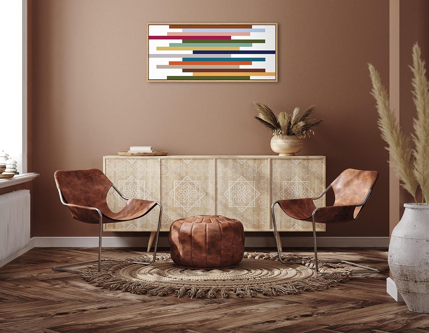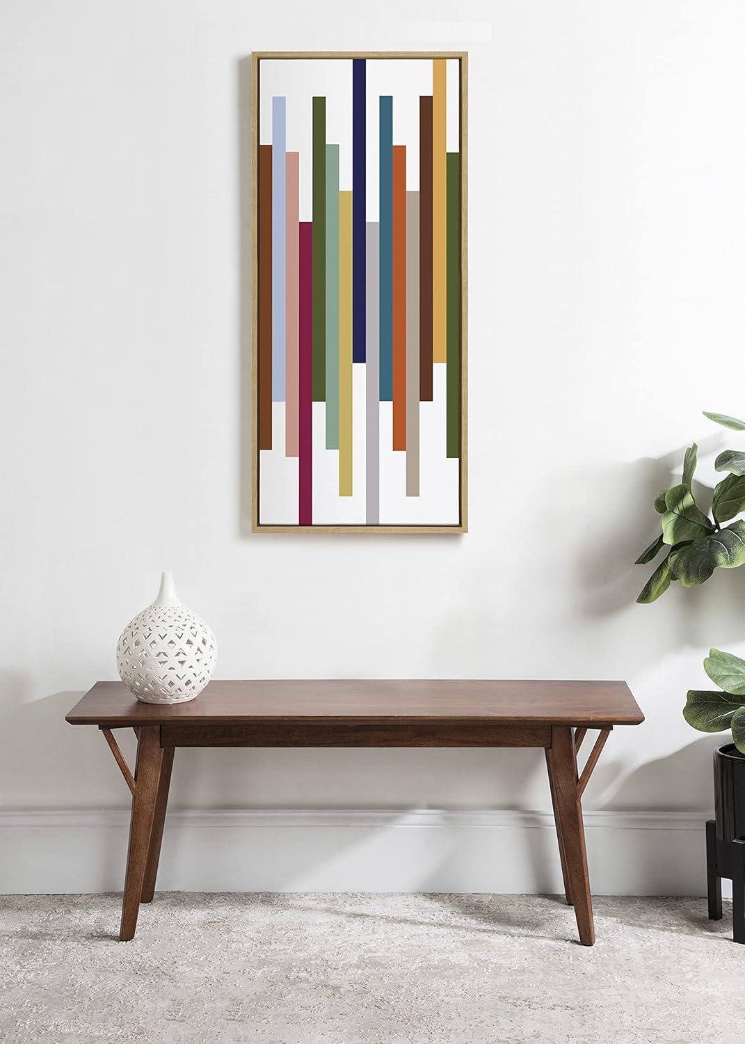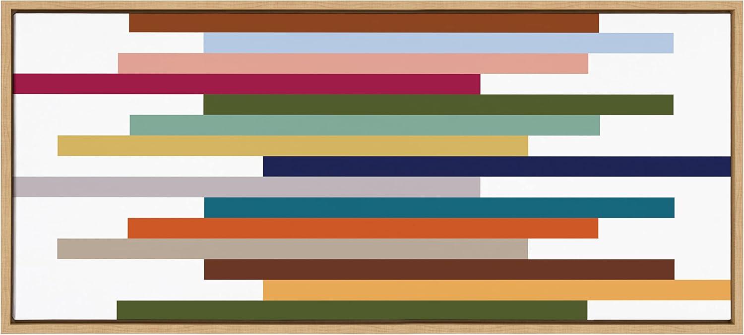 Mushroom brown, pale baby blue, pinky peach, olive green, deep navy, peaceful purple, harvest yellow and midnight maroon are just a few of the colors of this colorful modern abstract panel print. Being long and narrow it's perfect for that tall skinny vertical space or wide skinny horizontal space. Pair it with itself in a different orientation to create a more dramatic statement. Framed in the USA in Waunakee, Wisconsin, this floating canvas art will be a pleasure to look at every day in your living room, bedroom, nursery, or any room in the home. This art print also makes an excellent gift for birthdays, holidays, or house-warming parties. Printed on gallery-wrapped canvas and framed with a lightweight polystyrene frame, this wall art is easy to display on the wall. The outer dimensions are 18 inches by 40 inches by 1.6 inches. Print Name: “Modern Color Block Stacks”