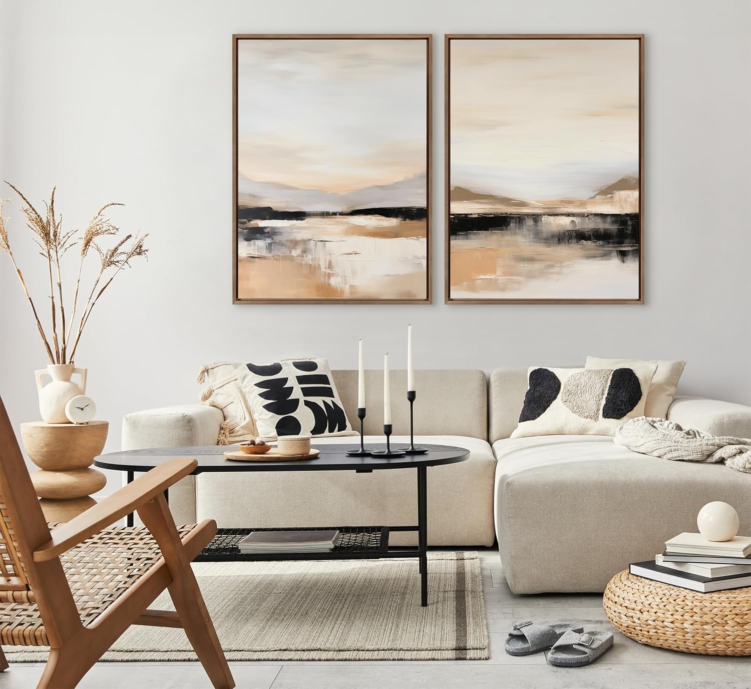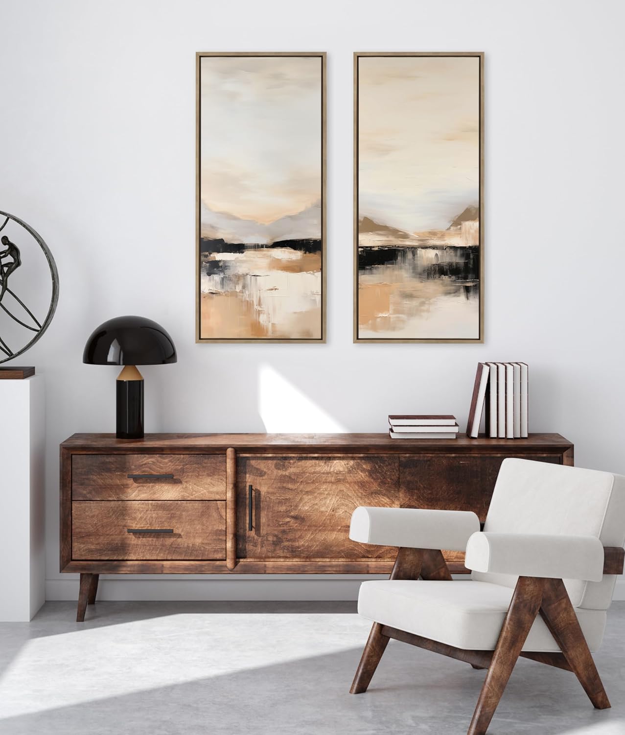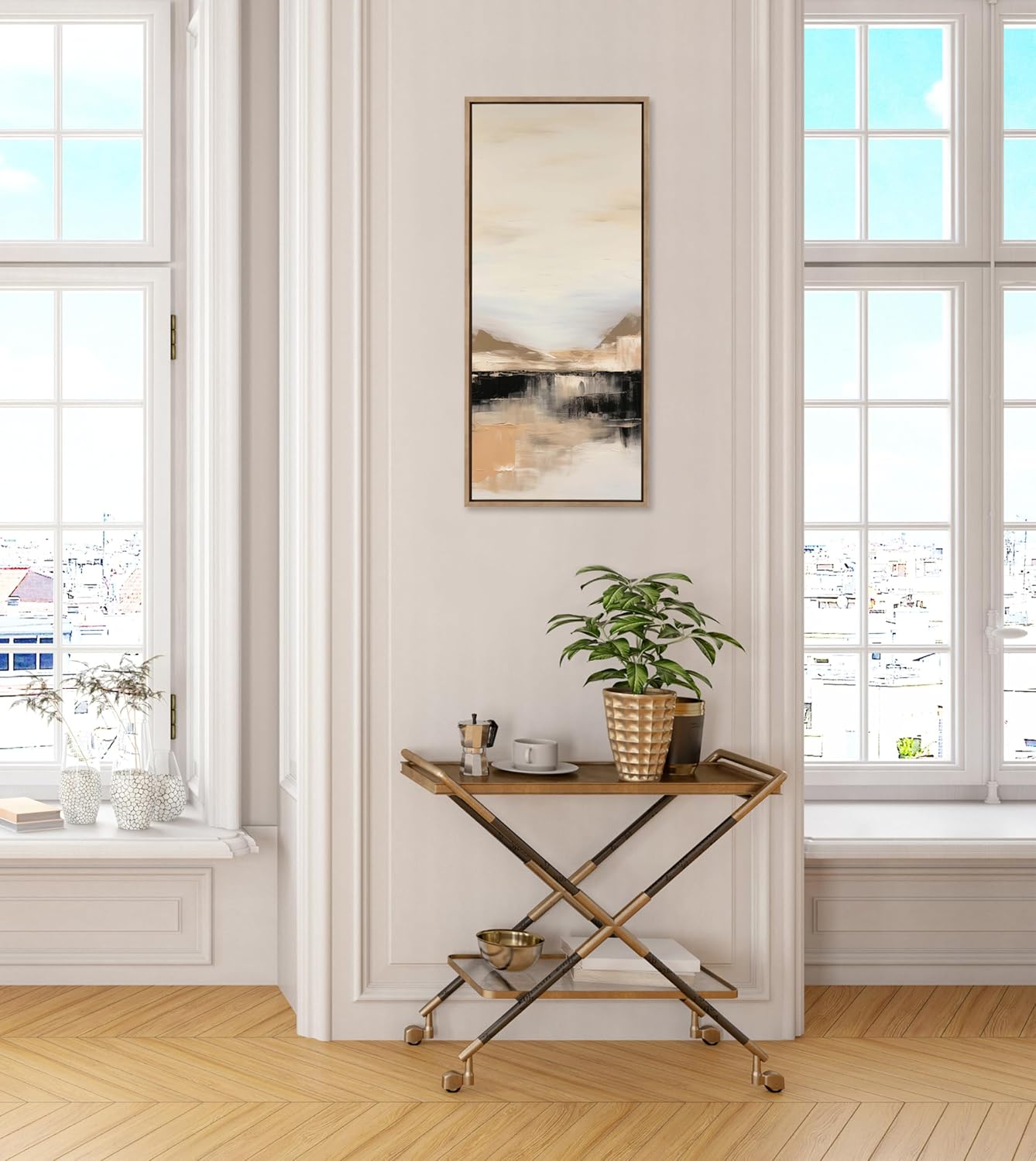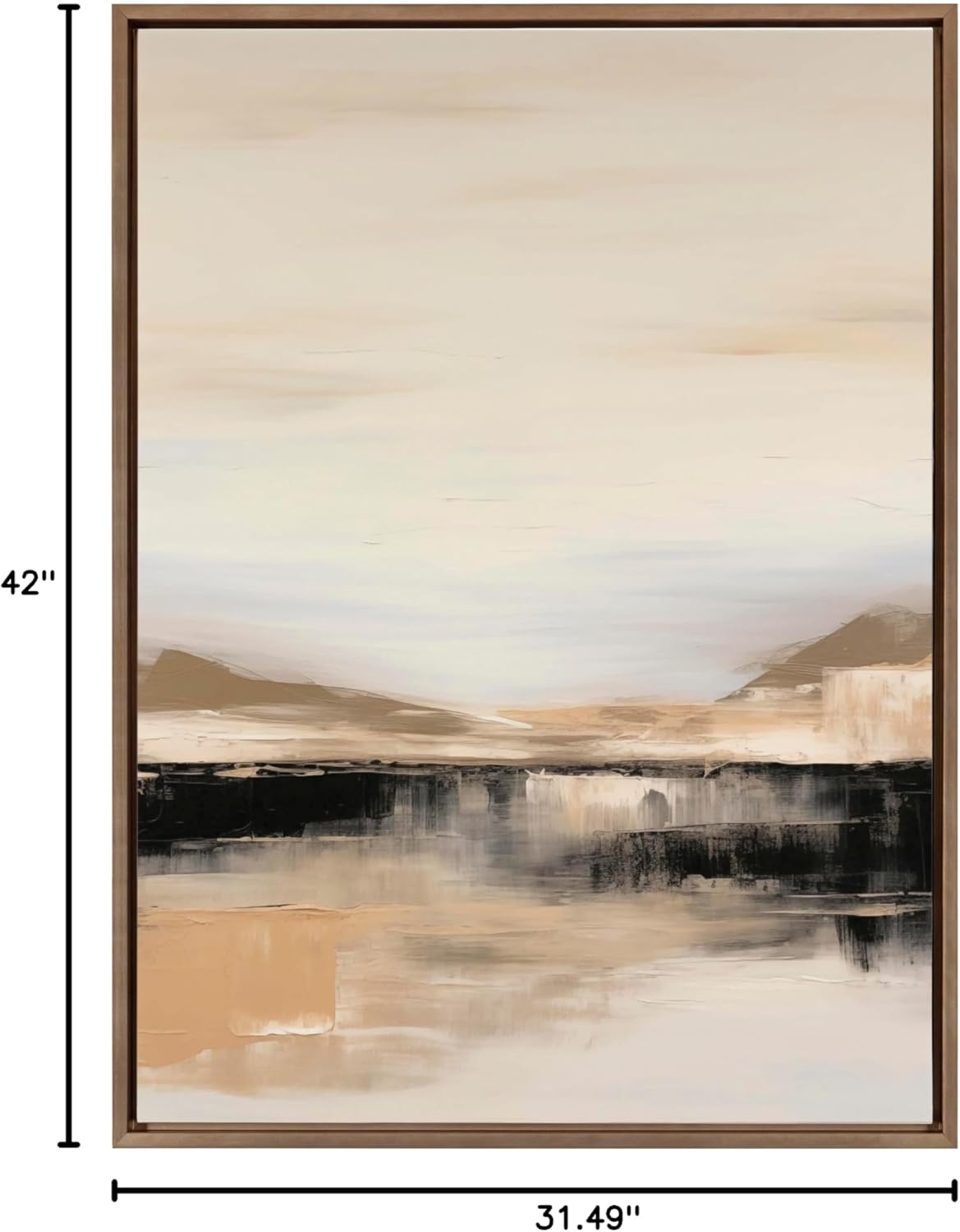 Experience the beauty of abstract landscapes with this serene artwork, featuring a peaceful vista rendered in subtle tones and gentle brushstrokes. Its minimalist design and modern aesthetic add a touch of sophistication to your decor, making it a versatile piece for complementing various interior styles. Framed in the USA in Waunakee, Wisconsin, this modern floating canvas art is sure to bring joy to your space. Our design team curates art that will fit perfectly in any room of your home. Showcase this art in your living room, bedroom, home office, kitchen, bathroom, nursery, or anywhere you want to bring a little beauty and charm to your walls. Specializing in home décor, we are continually bringing timeless works of art for the traditional decorator as well as trend-forward pieces for that eclectic art lover. Our high-quality framed canvas art also makes excellent gifts for birthdays, holidays, or housewarming parties. Printed on gallery-wrapped canvas and framed with a simple gallery frame this wall art is easy to display on the wall and will match with any décor style. The outer dimensions are 18 inches by 40 inches by 1.6 inches. Print Name: “Peaceful Landscape II”