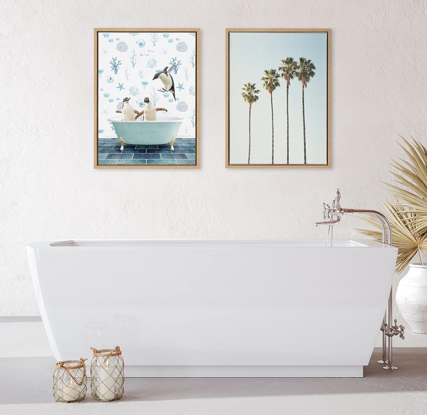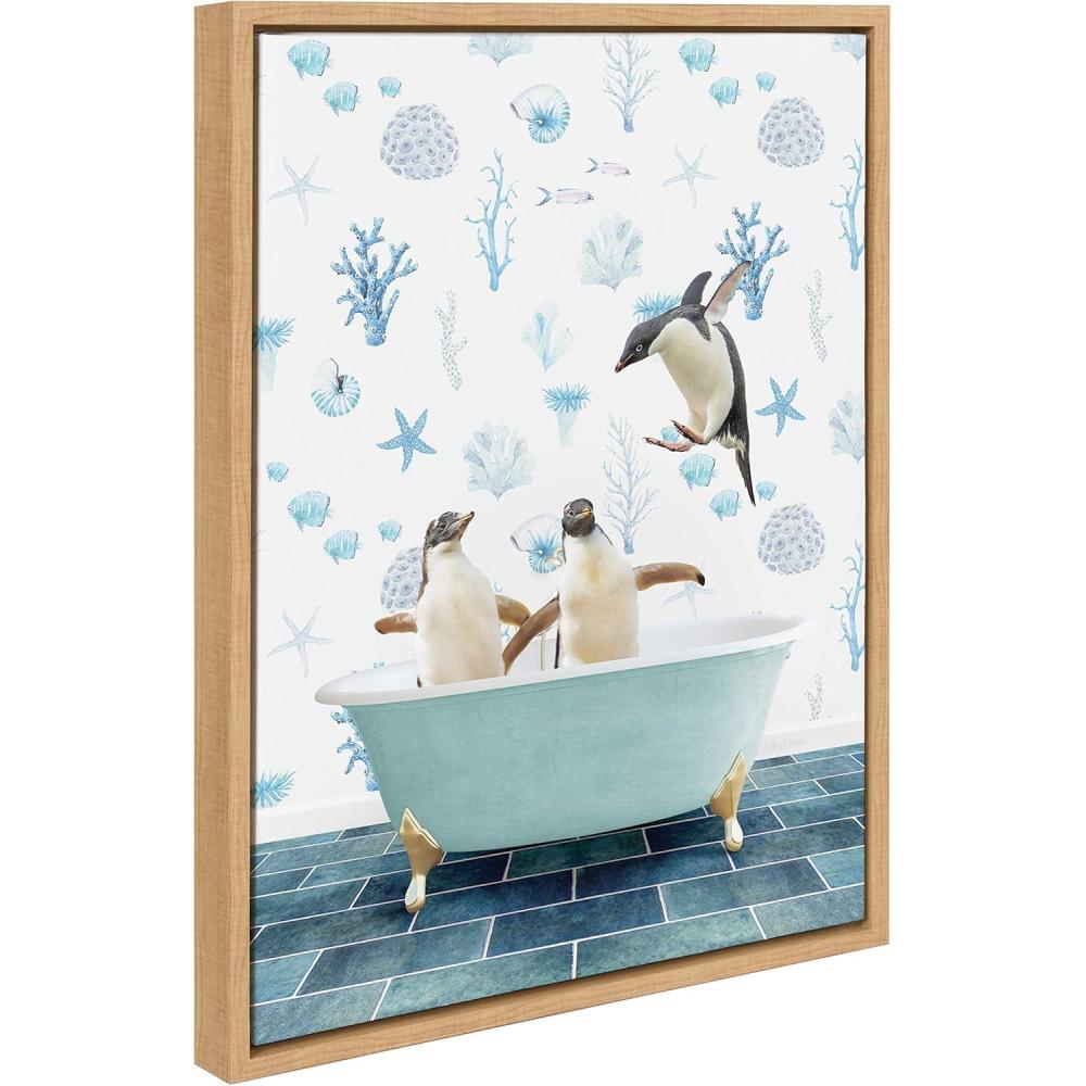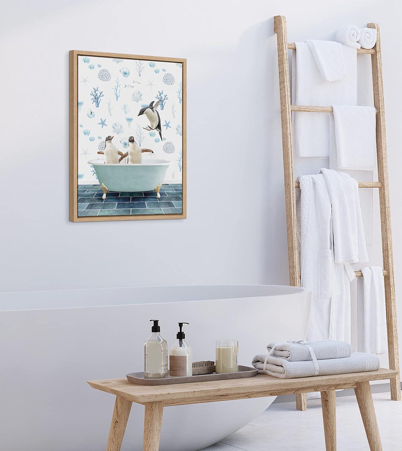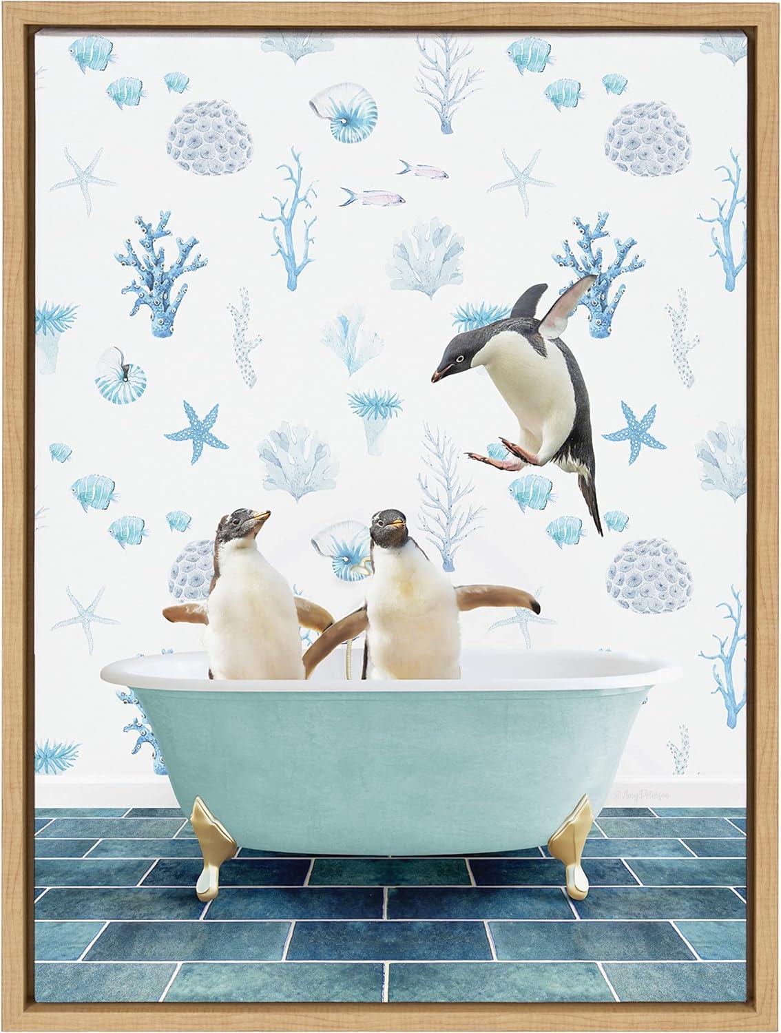 Kate and Laurel Sylvie Penguins In Under the Sea Bath Framed Canvas Wall Art by Amy Peterson Art Studio; 18×24 White; Coastal Bathroom Art Wall Décor(Natural)