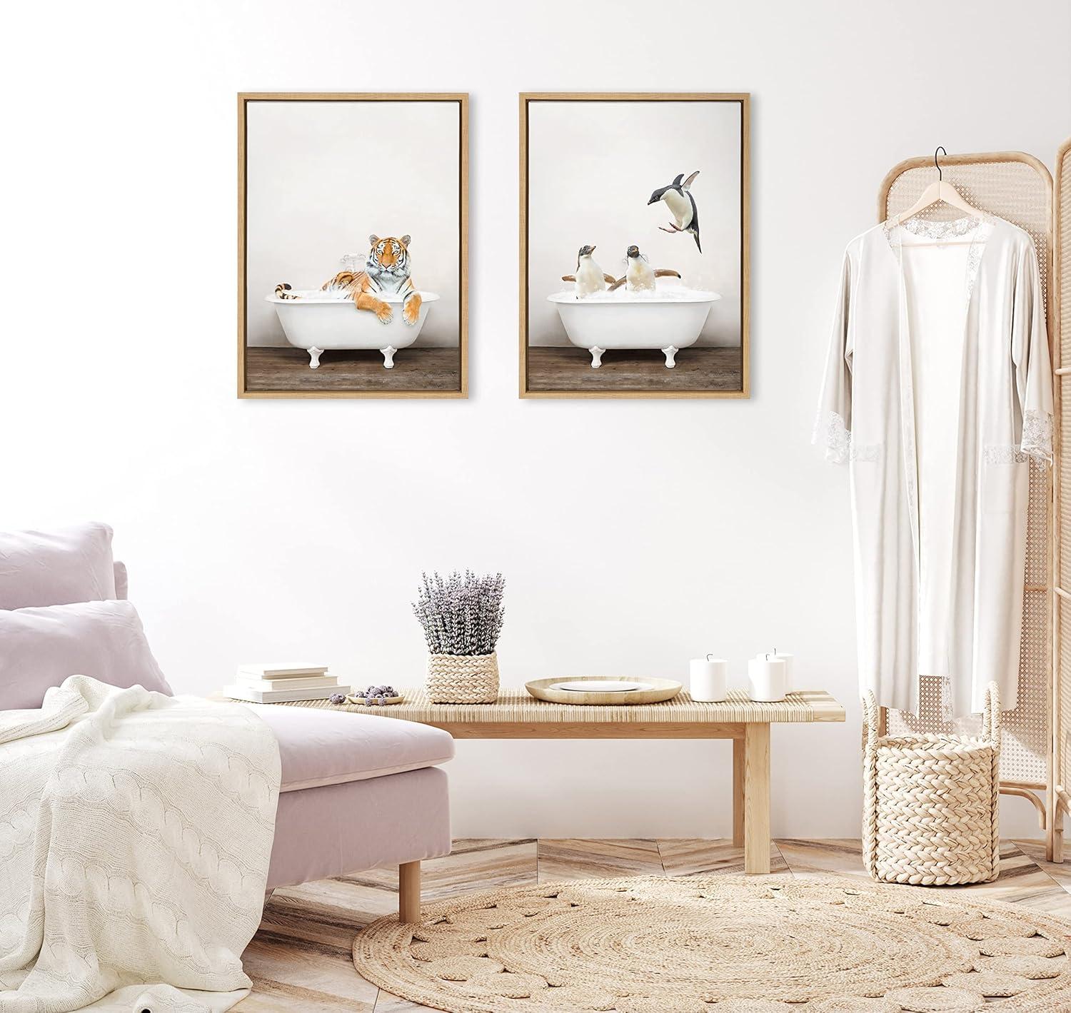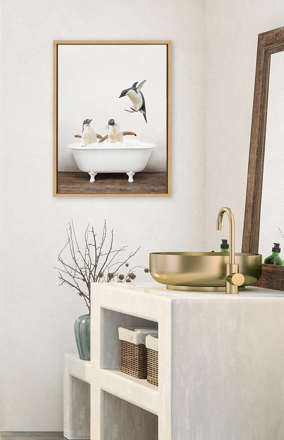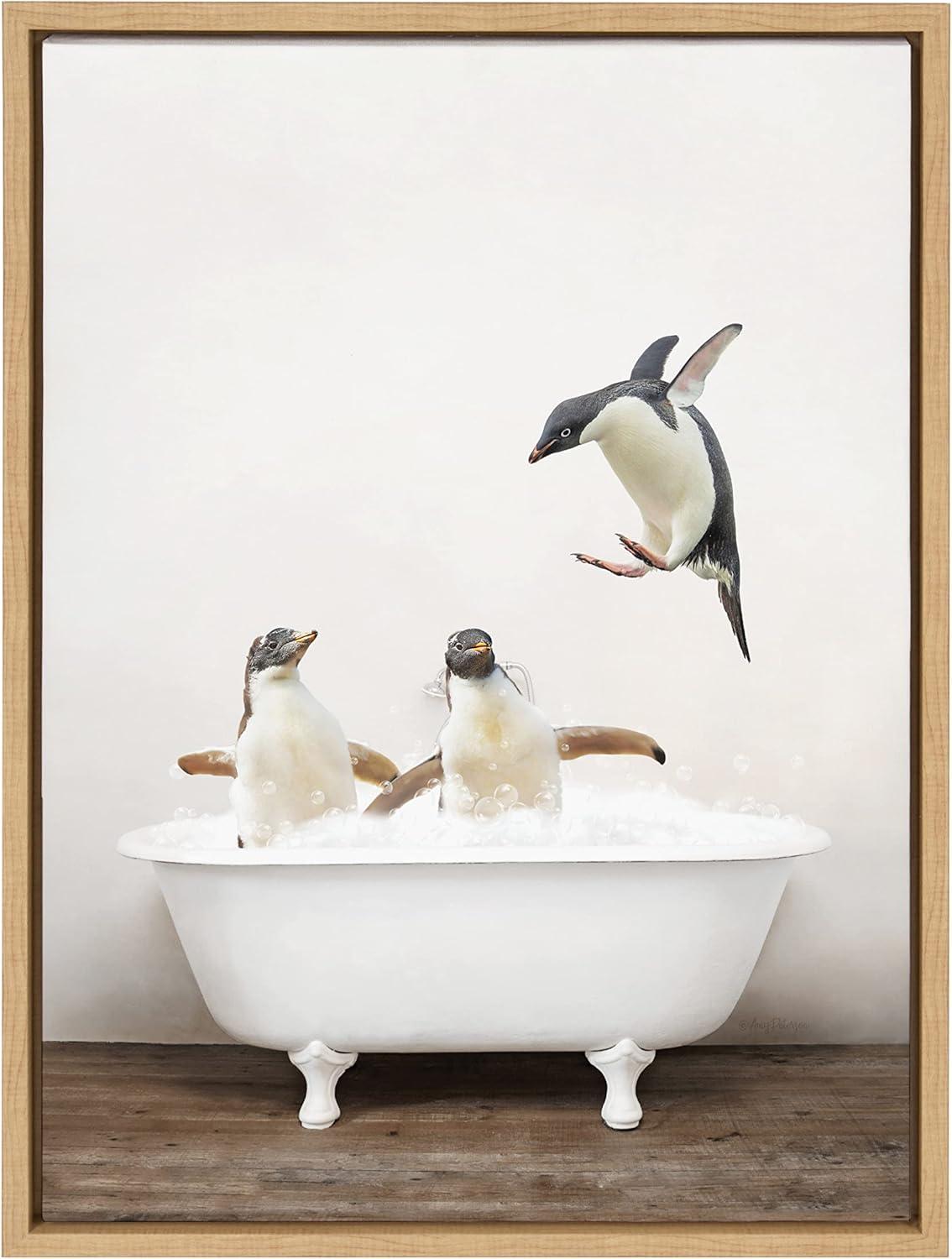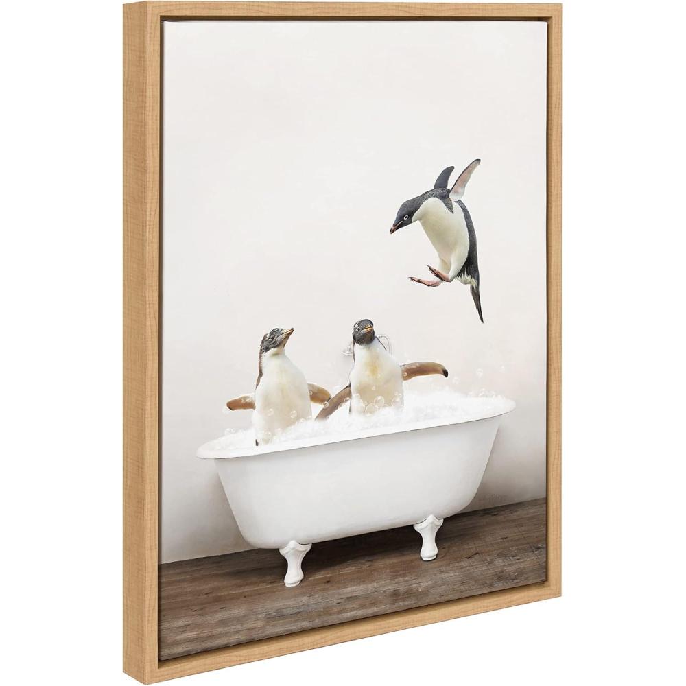 Make a bold impression on your house guests with this whimsical animal art piece by artist Amy Peterson. With its sleek modern frame, this fun, contemporary design is the perfect art piece to add to your home decor collection. Framed in the USA in Waunakee, Wisconsin, this floating canvas art will be a pleasure to look at every day in your living room, bedroom, nursery, or any room in the home. This art print also makes an excellent gift for birthdays, holidays, or house-warming parties. Printed on gallery-wrapped canvas and framed with a lightweight polystyrene frame, this wall art is easy to display on the wall. The outer dimensions are 18 inches by 24 inches by 1.6 inches. Print Name: “Penguins Playing in Rustic Bath”