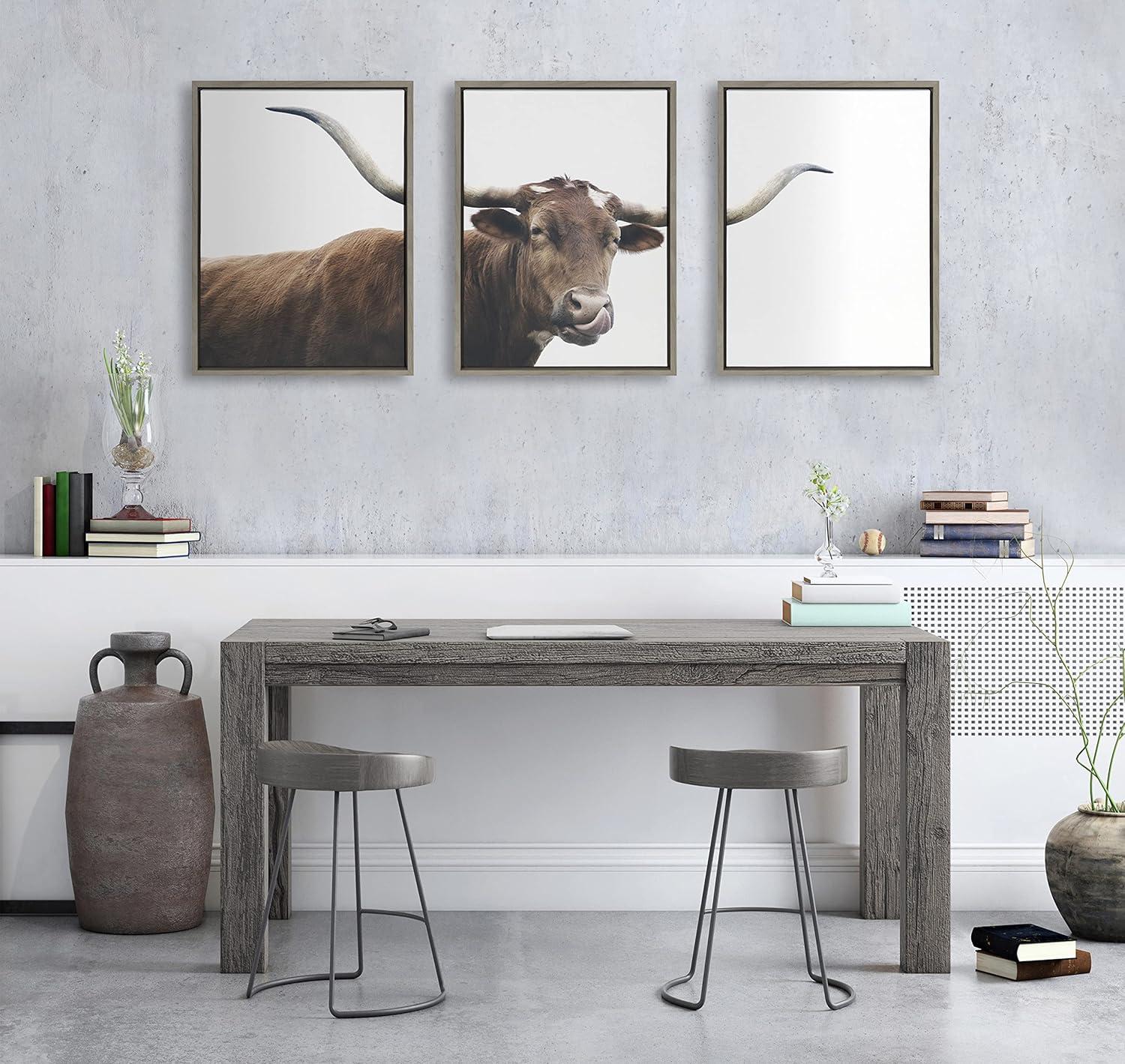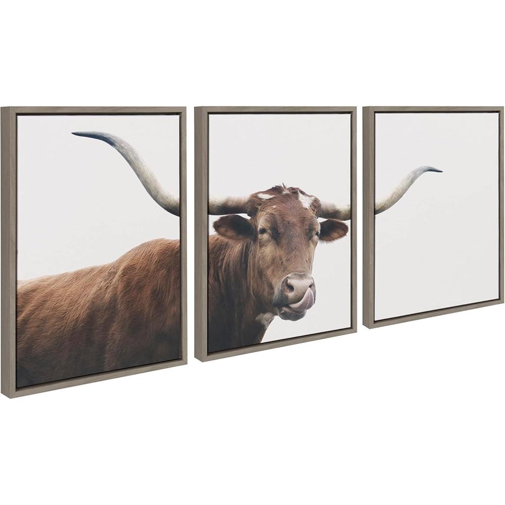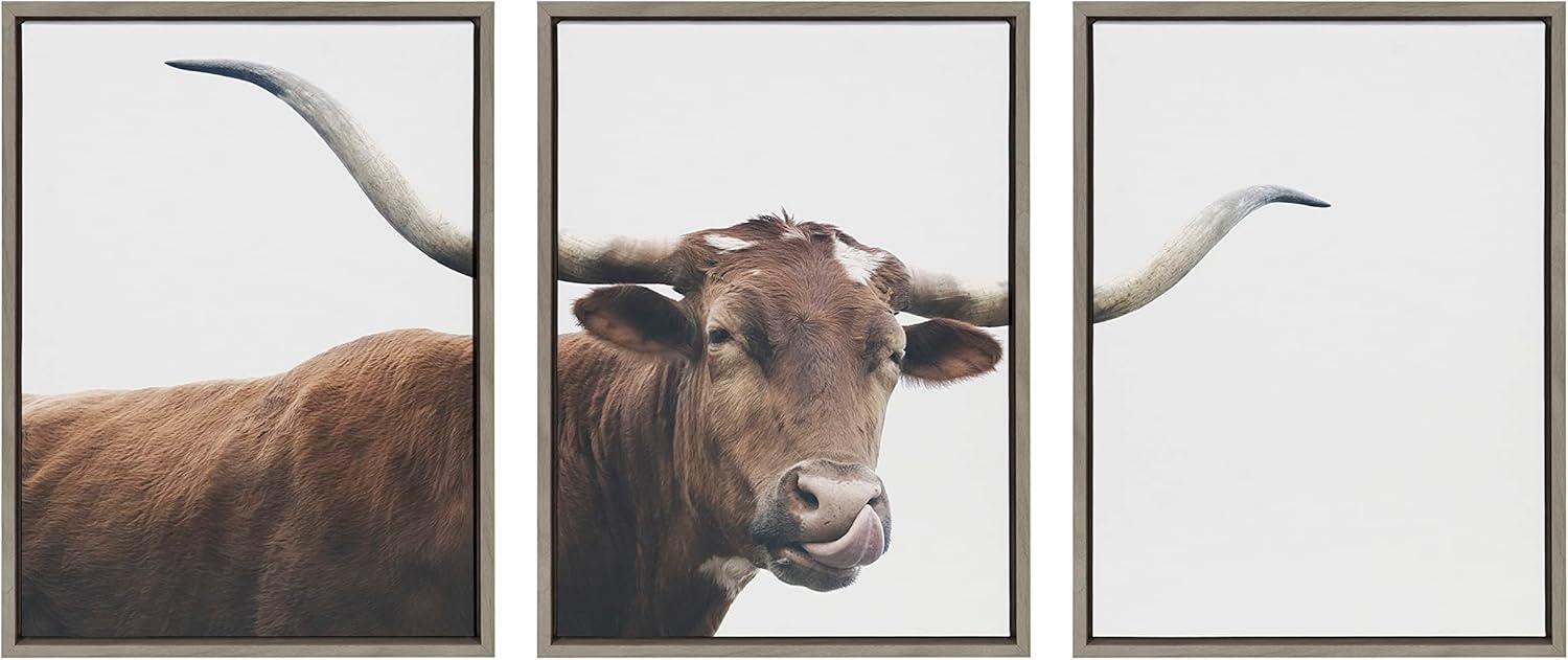 This three-piece set of this rustic Texas Longhorn is the perfect refined addition to your home. Framed in the USA in Waunakee, Wisconsin, this floating canvas art set will be a pleasure to look at every day in your living room, bedroom, nursery, or any room in the home. This art print also makes an excellent gift for birthdays, holidays, or house-warming parties. Printed on gallery-wrapped canvas and framed with a lightweight polystyrene frame, this wall art is easy to display on the wall. The outer dimensions are 18 inches by 24 inches by 1.6 inches. Print Name: “Texas Longhorn Cow Lick 1 2 3”