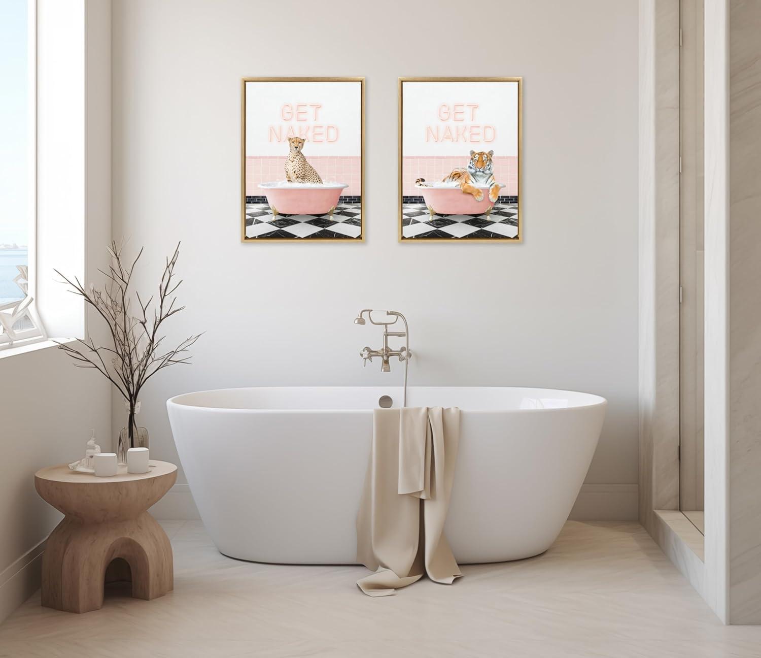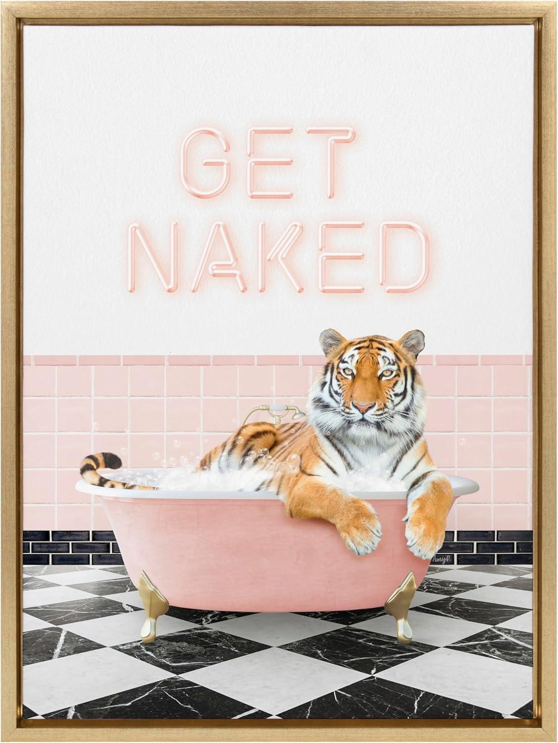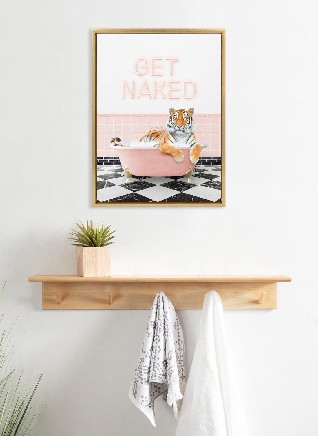 This cheeky artwork features a tiger embracing retro vibes in a pink bath, adding a playful touch to your decor. Its humorous depiction and bright gold frame create a sense of whimsy and fun, making it a perfect addition to any room in need of a lighthearted atmosphere. Framed in the USA in Waunakee, Wisconsin, this modern floating canvas art is sure to bring joy to your space. Our design team curates art that will fit perfectly in any room of your home. Showcase this art in your living room, bedroom, home office, kitchen, bathroom, nursery, or anywhere you want to bring a little beauty and charm to your walls. Specializing in home décor, we are continually bringing timeless works of art for the traditional decorator as well as trend-forward pieces for that eclectic art lover. Our high-quality framed canvas art also makes excellent gifts for birthdays, holidays, or housewarming parties. Printed on gallery-wrapped canvas and framed with a simple gallery frame this wall art is easy to display on the wall and will match with any décor style. The outer dimensions are 18 inches by 24 inches by 1.6 inches. Print Name: “Tiger Get Naked Retro Pink Bath”