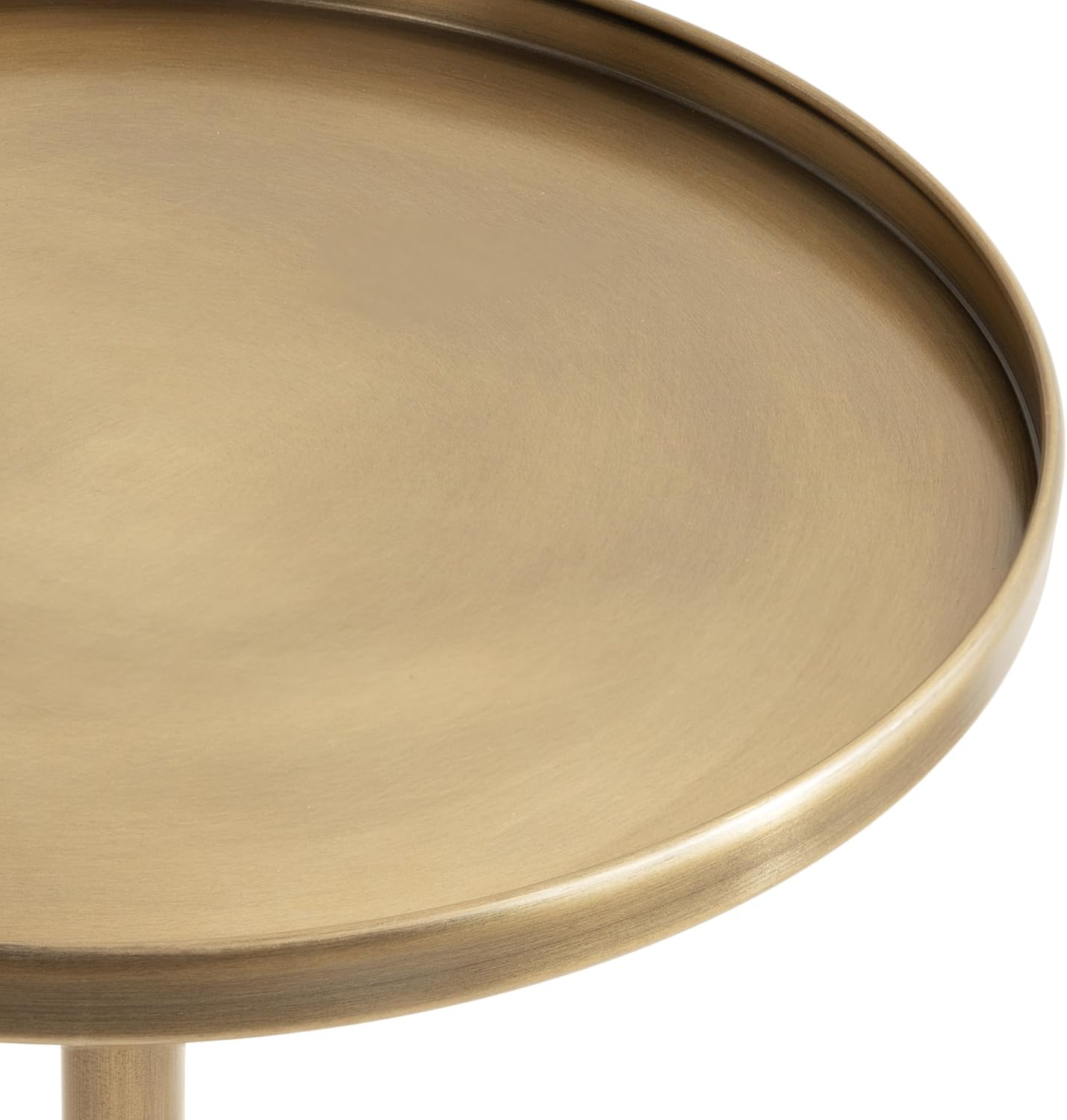 Introducing the Kate and Laurel Tira round side table, a captivating blend of modern glam and natural elegance. The striking combination of the antique brass tabletop and the satin black painted wood base creates a luxurious aesthetic that is sure to impress. The brass tabletop also features a slight lip to contain your items and prevent spills. This charming cocktail table is a beautiful accent for serving and placing drinks when friends are around due to its protective lip and sturdy solid wood base. Its compact size and round design allow for easy placement and rearrangement to suit your needs. This exquisite circular end table boasts dimensions of 14 inches wide by 23.25 inches high, making it the perfect companion for your living room, bedroom, or any space in need of a stylish accent piece. Whether you place it next to your sofa, by your bedside, or in a cozy reading nook, this versatile side table effortlessly enhances any space. The circular shape promotes a harmonious flow. It also offers ample surface area for holding drinks, snacks, or a good book within arm's reach.