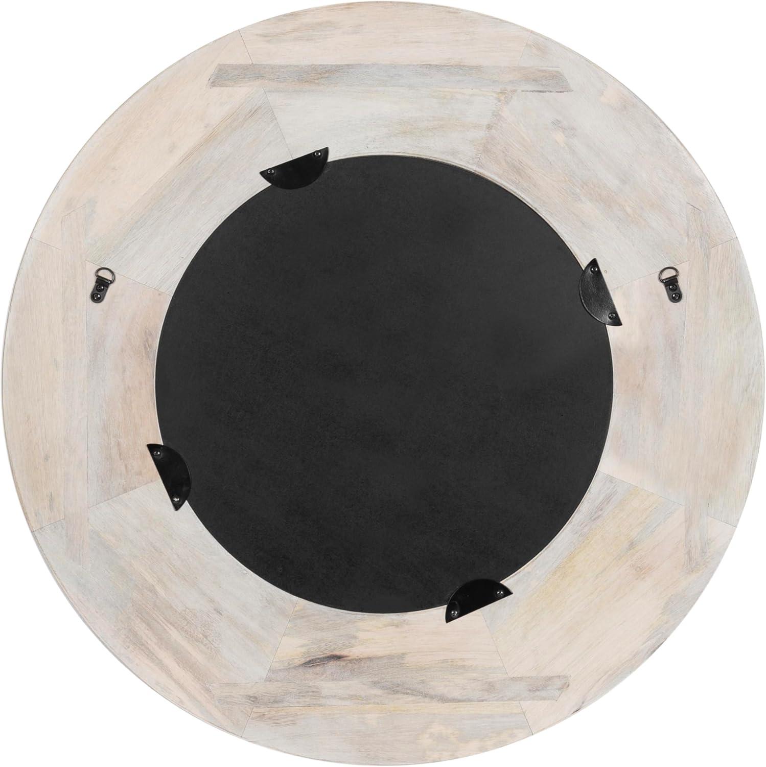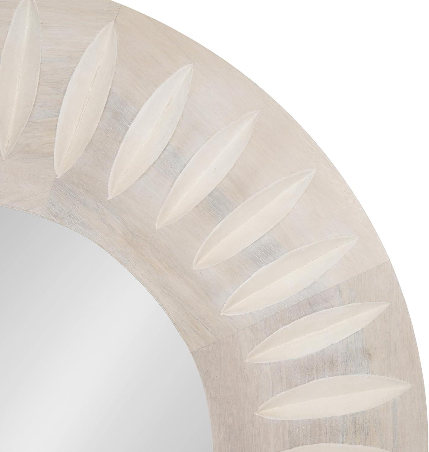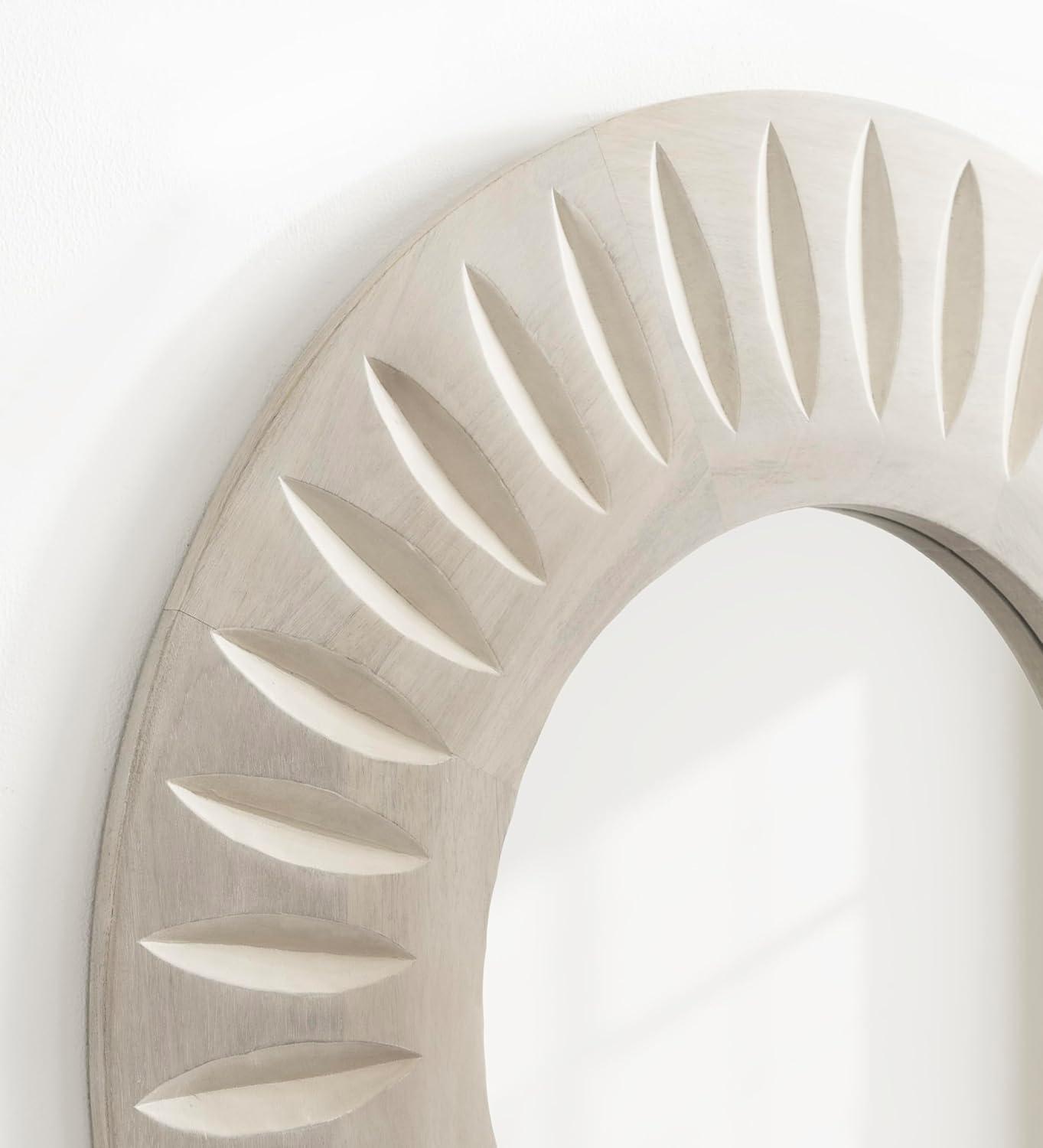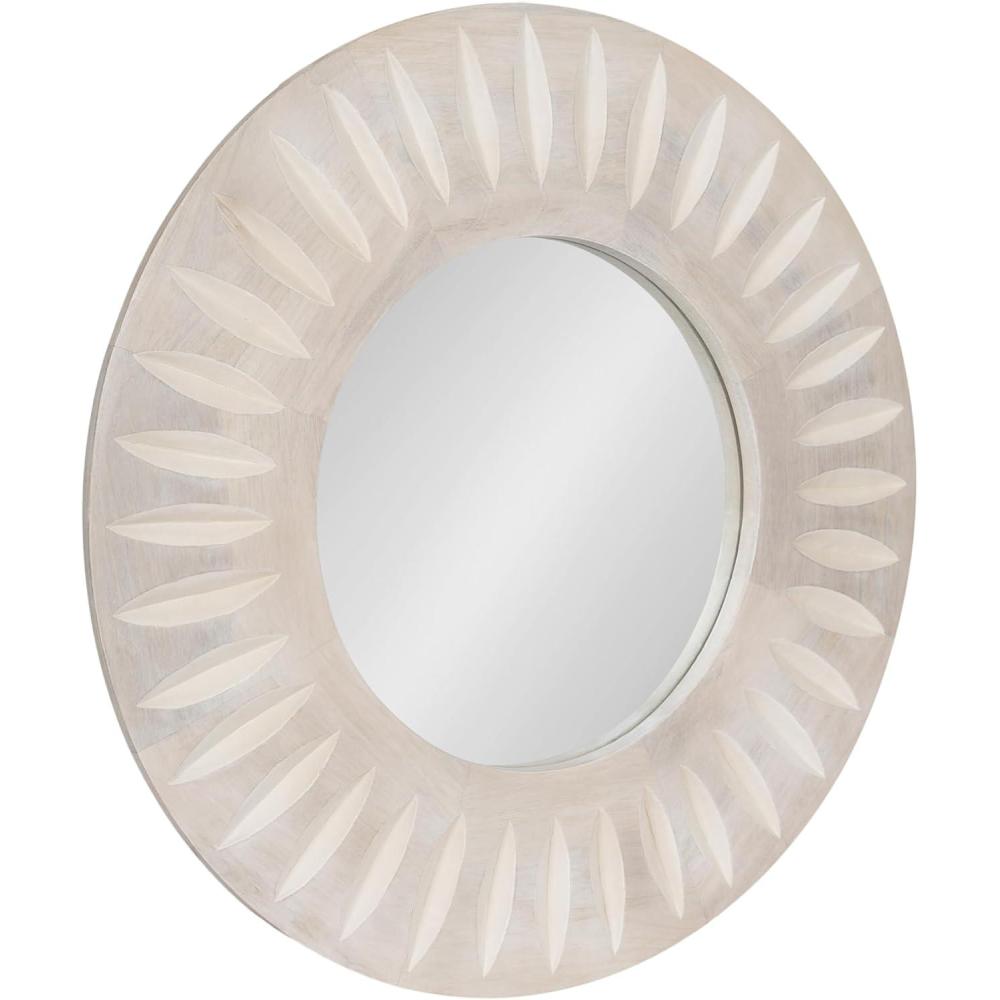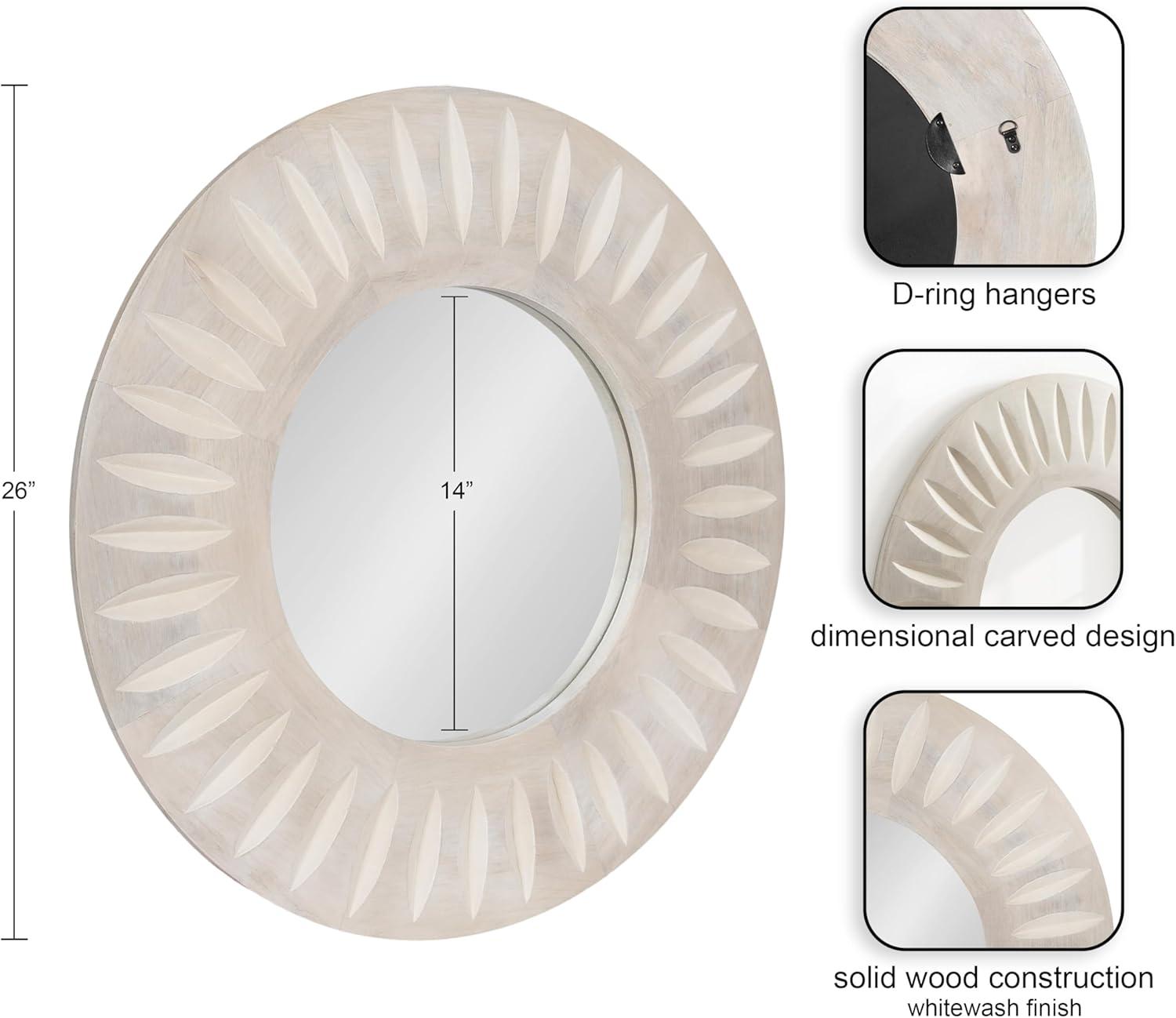 Transform your living room or bathroom decor with the charming Usra round wall mirror. Crafted with precision, the mirror features delicately carved indentations that radiate from the center, creating a captivating sunburst effect. This intricate detailing adds depth and texture, elevating the mirror from a functional piece to a work of art. The whitewashed finish imparts a light, airy feel, making it perfect for both modern and traditional interiors. The high-quality wooden frame ensures durability and longevity, while the carefully selected materials contribute to its natural, organic look. This versatile mirror is not only a practical addition to your living space but also a decorative statement piece. It effortlessly complements a variety of color palettes and decor styles, making it a versatile choice for any room in your home. Whether hung in your entryway, living room, bedroom, or bathroom, the Usra mirror will reflect light and create the illusion of a larger, more open space. Measuring 26 inches in diameter, this exquisite piece is designed to add a touch of contemporary charm to any space. With attached metal D-ring hangers, this mirror is easy to hang and ready to grace your walls in no time.