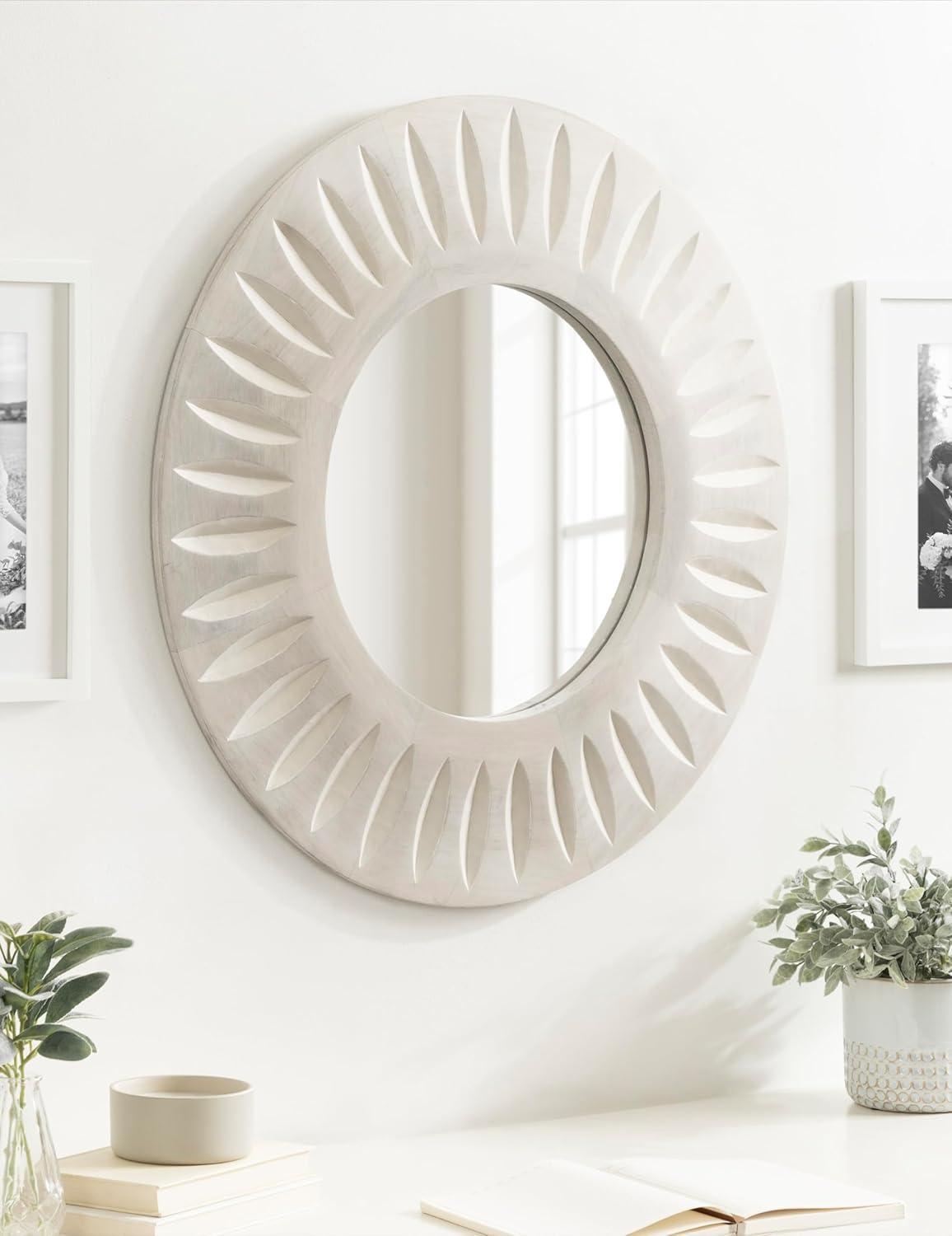 Kate and Laurel Usra Round Carved Wood Mirror, 26 Inch Diameter, Whitewash, Light Wooden Circle Mirror with Carved Indentation and Sunburst Wall Mirror Look