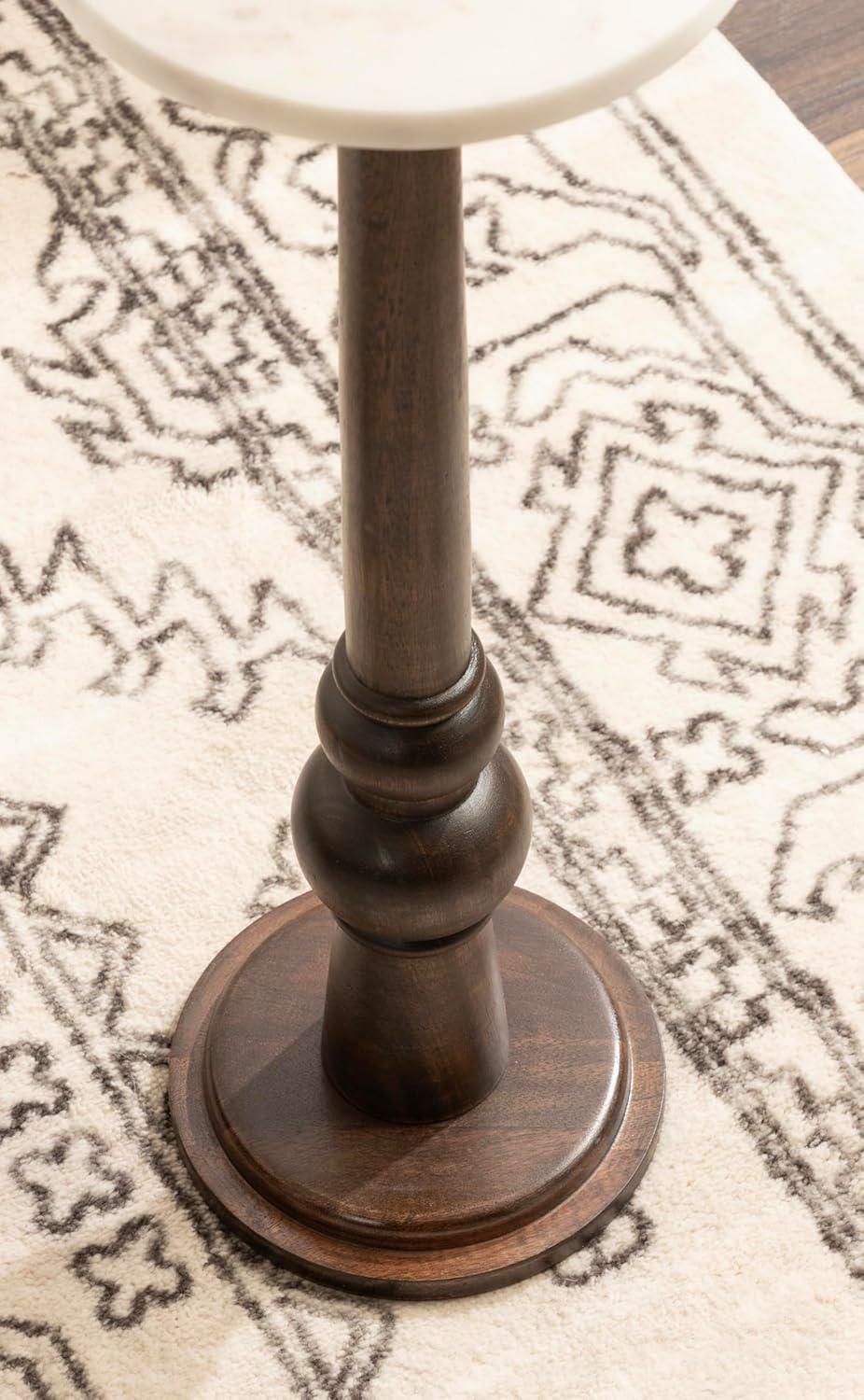 Introducing our beautifully crafted marble top drink table, the perfect addition to any living room, home office, or sunroom. Made from high-quality mango wood with an authentic marble tabletop, this table offers a stylish turned leg and a sturdy, reliable surface to hold your drinks, plants, or any items you may need within reach. Measuring at 23 inches in height and 8 inches in diameter, this table is the perfect size to fit next to your favorite armchair or couch. The rich, dark walnut finish of the wood provides an elegant and timeless look that complements any decor style. Not only is this wooden drink table functional and stylish, but it's also durable and long-lasting. The mango wood construction ensures that it can withstand regular use and will feature unique variations within the woodgrain based on its organic wood structure. Plus, its compact size makes it easy to move around and store when not in use. This versatile table is perfect for enjoying a relaxing evening at home or hosting a gathering with friends and family. The two-step assembly is quick and easy with no hardware needed. The instructions are clear and concise, making it a breeze to put together in just a few minutes.