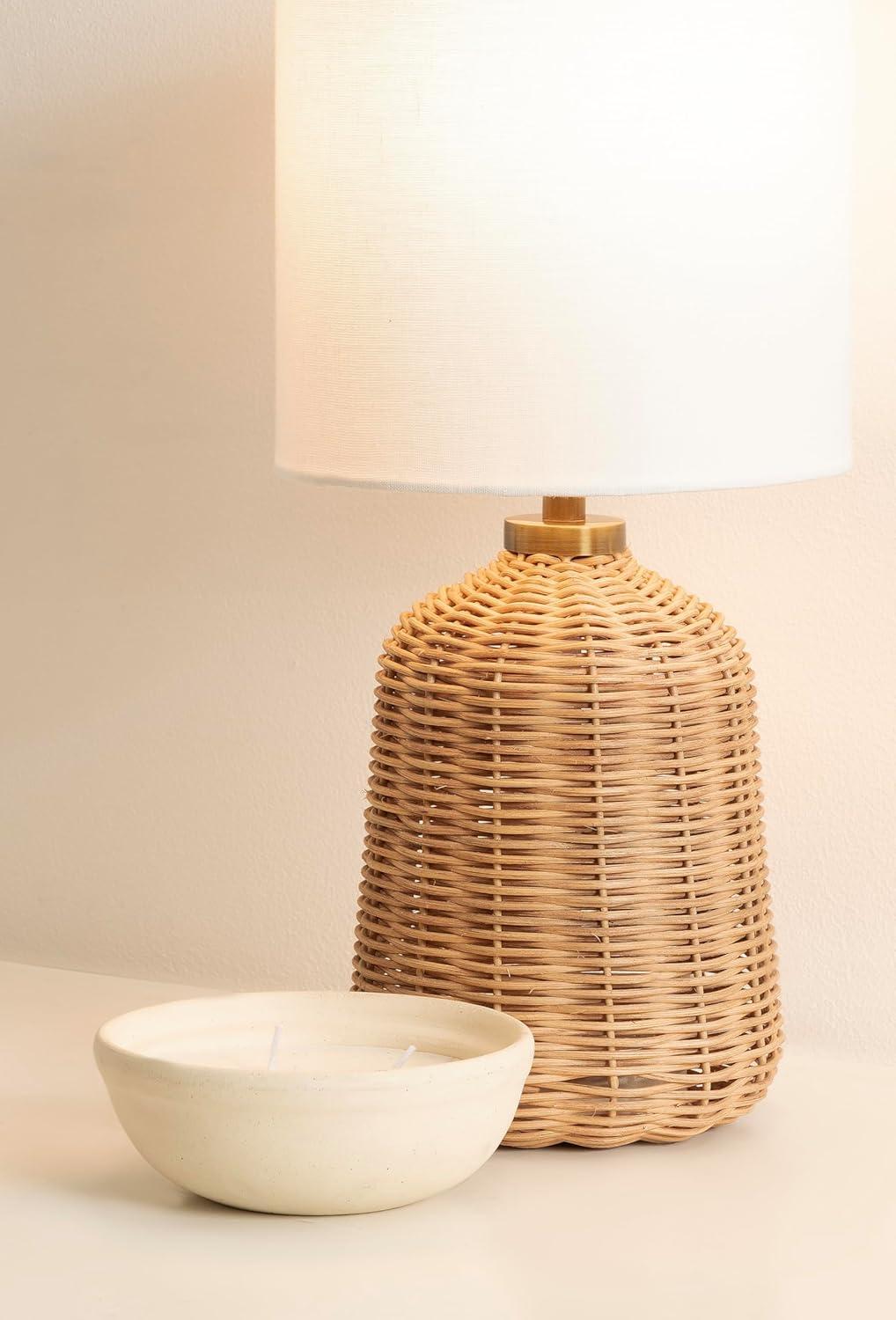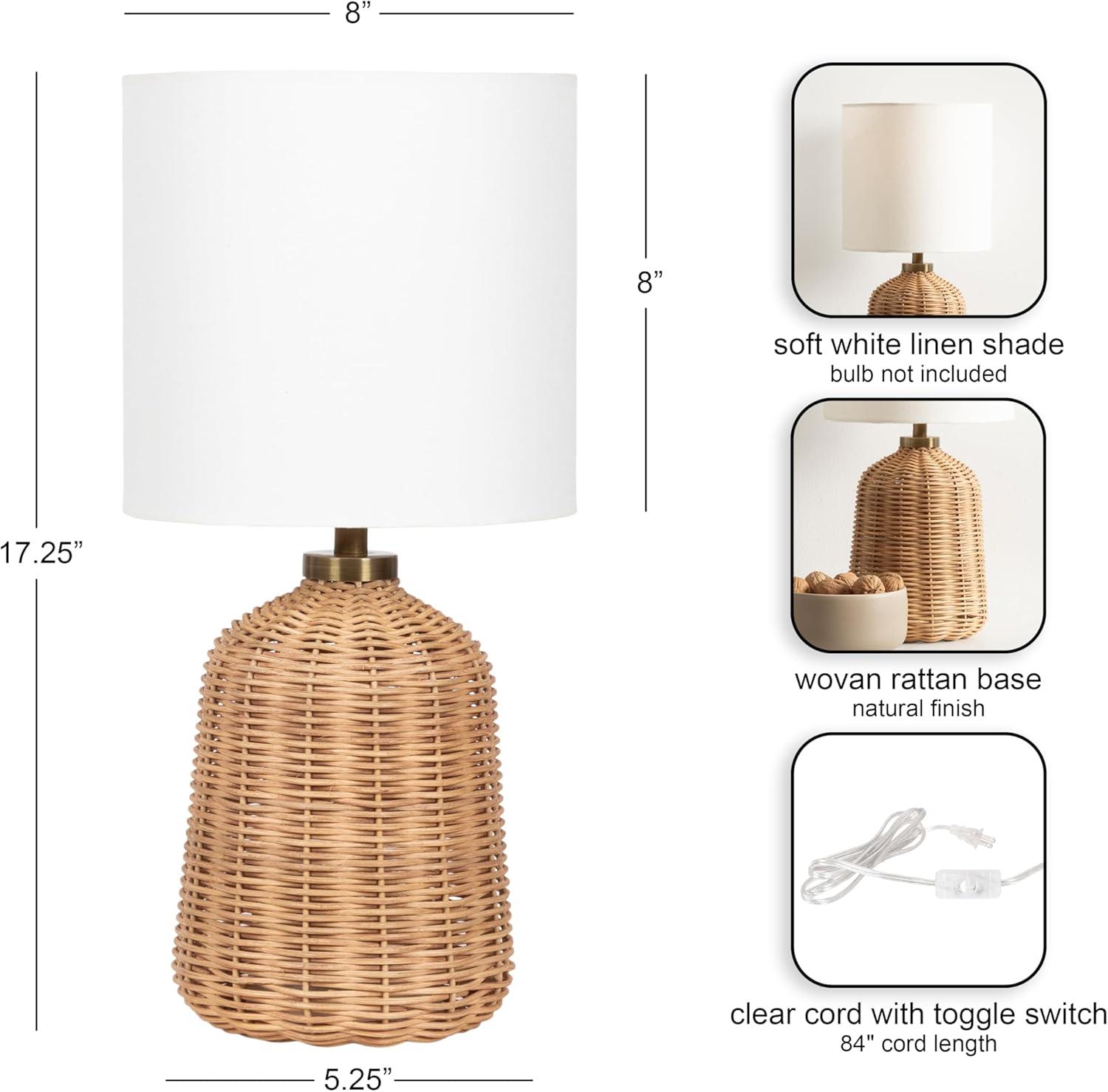 Elevate your home lighting with the Wylla bedside table lamp from Kate and Laurel—a natural piece that blends functional design with contemporary decor. Standing 17.25 inches tall, this compact yet eye-catching lamp features a sturdy 8-inch diameter with a woven rattan base, offering a modern aesthetic that complements a variety of decor styles, from minimalist to transitional. The rattan base with its woven texture adds an artistic flair, making it as much a decorative object as a source of light. Topped with a soft white linen drum shade, the Wylla lamp diffuses light softly, creating a warm and inviting atmosphere perfect for bedrooms, living rooms, or home offices. Whether placed on a nightstand, console table, or desk, this lamp provides both style and substance. Designed for easy use with a standard E26 bulb (not included) that is up to 60 watts for an incandescent bulb or a 9W LED bulb, it's the perfect balance of practicality and elevated design. A UL-Certified product, this tabletop lamp can be used without worry. Add a modern edge to your space with this bold yet refined lighting piece.